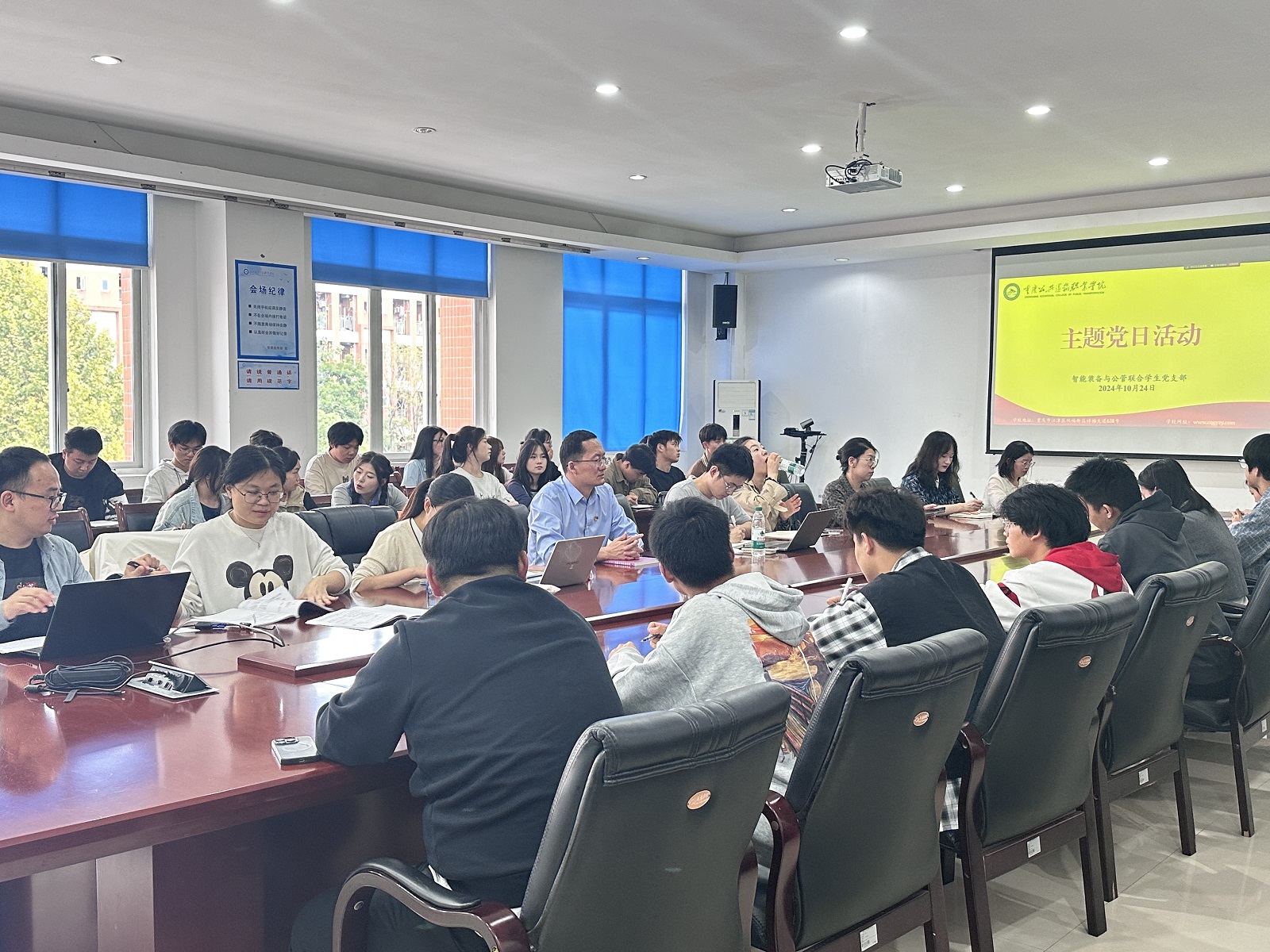 10月24日下午,智能装备与公管联合学生党支部在主校区A401会议室开展了“砥砺奋进正当时,昂首阔步新征程”主题党日活动,会议由学生党支部书记胥迅主持,全体党员、入党积极分子出席会议。