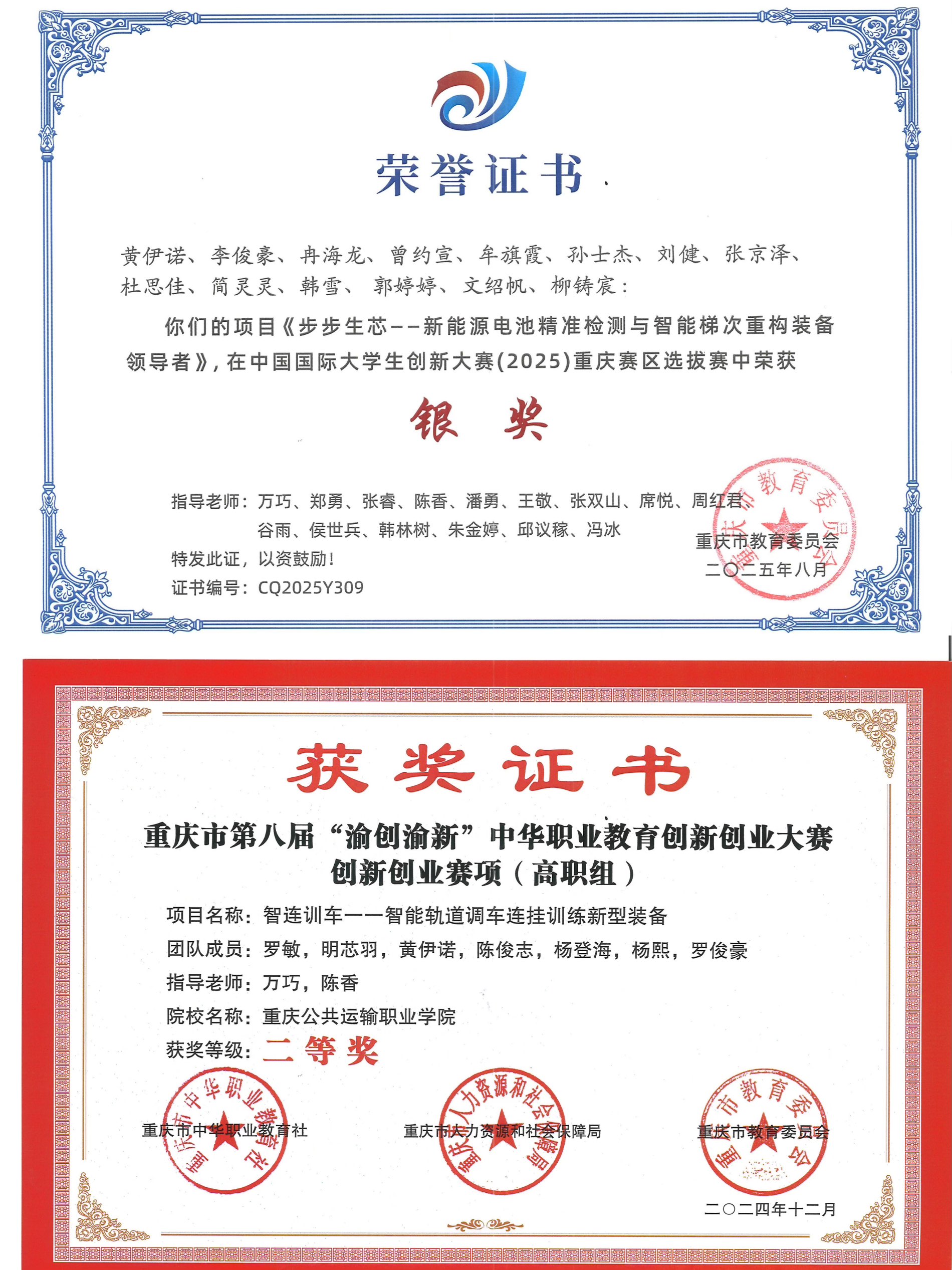 面对行业痛点,黄伊诺作为项目负责人,带领这支跨新能源汽车、机械自动化等专业组成的年轻团队,迎难而上。他们锚定“精准检测”与“智能梯次重构”两大核心,联合校企师资和资源,开启了攻关历程。初期,多系统数据融合算法成为难以逾越的“拦路虎”。不服输的她,牵头组织无数次跨专业研讨,整合前沿知识。从2024年寒冬组队,到盛夏站上中国国际大学生创新创业大赛重庆市总决赛舞台并斩获银奖(智能装备学院首个师生共同作为第一指导老师、第一参赛学生的创新项目),日夜兼程见证了团队的执着:白天上课,夜晚在指导老师带领下挑灯夜战;反复深入公交站场、聚光新材料等专精特新企业调研论证;在实训室进行数据测试与迭代优化。