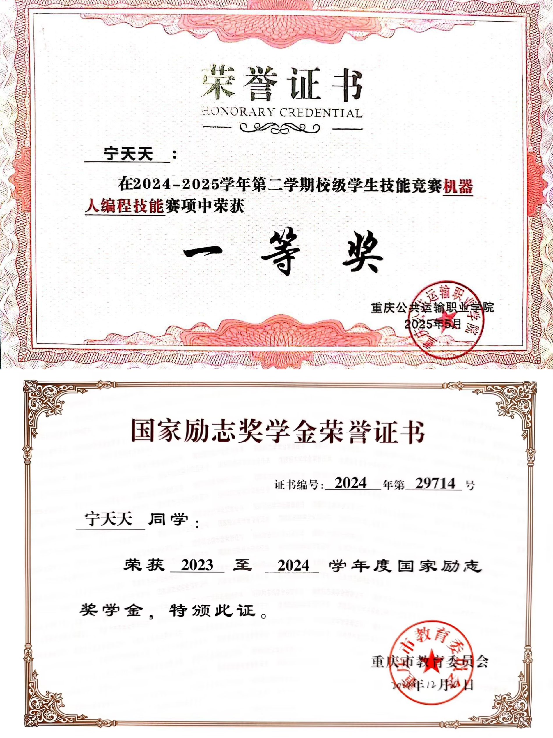 天道酬勤。连续两个学年宁天天的学业成绩、综合测评成绩、总成绩与职业素质积分均稳居专业第一。这份耀眼的成绩单,映射着无数个清晨的诵读与深夜的演算。优异的学业表现,使他先后荣膺“国家励志奖学金”“成才杯励学奖学金”及校级“一等奖学金”。“我坚信日积月累的力量,”他坦言,“厚积方能薄发。”这些荣誉,是对过往的肯定,更是驱动他不断攀登新高峰的号角。