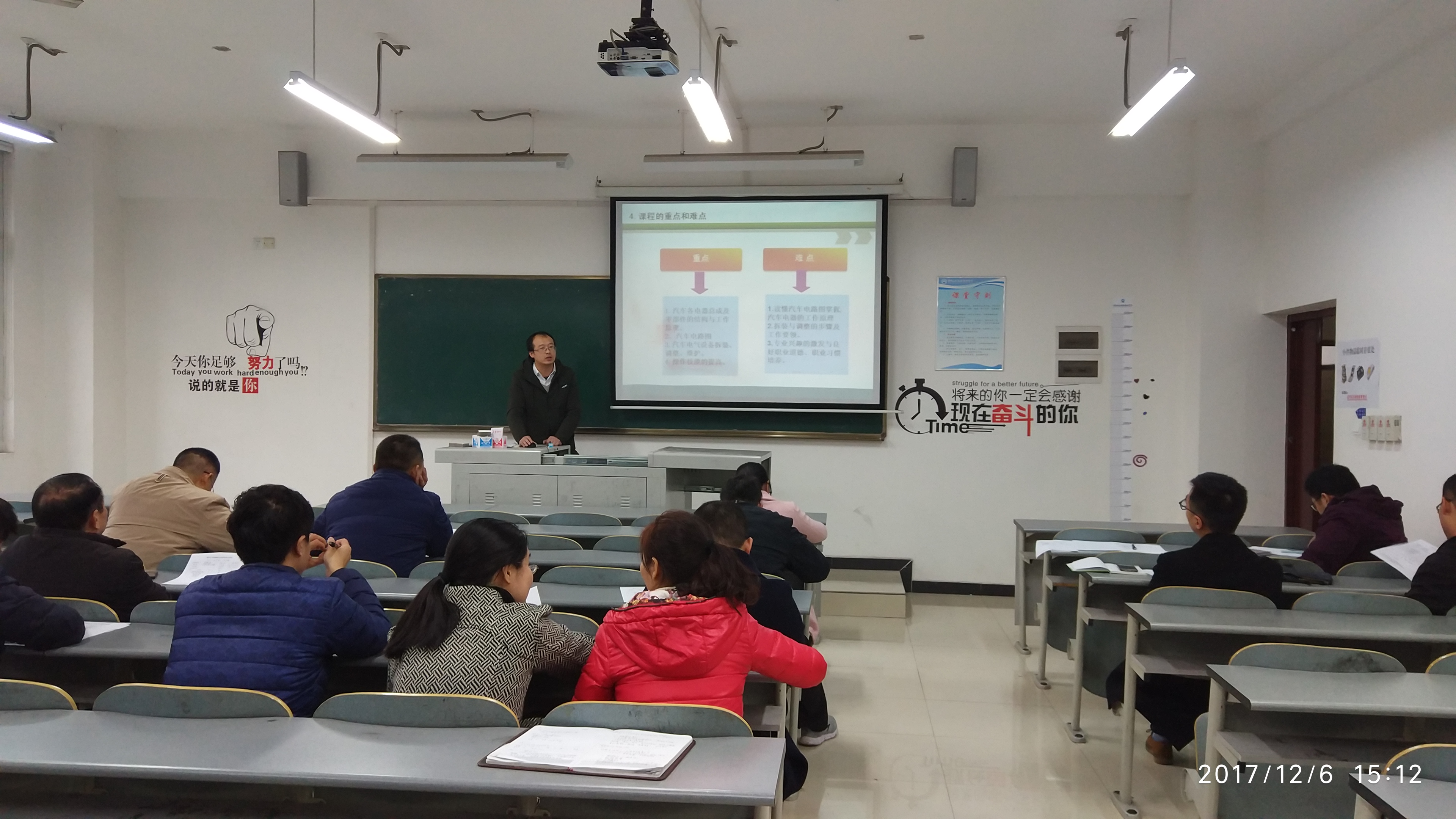 智能装备学院 学院新闻 学生活动 学院新闻首页 > 智能装备学院 > 学院动态 > 学院新闻 > 汽车工程系举办青年教师说课比赛活动 来源:学院新闻发布时间:2017-11-08 17:15访问量: 2017年11月8日下午,在系主任袁可夫的主持下,汽车工程系“青年教师说课比赛”初赛在教学楼C302举行,比赛评分原则以“说课环节、讲课环节、仪容仪态、PPT制作质量”四个方面进行综合评分。 说课讲课过程中,青年教师们表现得体、慷慨激昂。说课环节主要从说课程、说学法、说教法、说教学过程四个方面对青年教师进行评价,讲课环节主要从教学内容、教学效果两个方面对青年教师进行评价。 此次说课比赛的举行,有助于鼓励青年教师们努力提升自身教学水平、提高课堂效率、促进教学方法的相互学习。