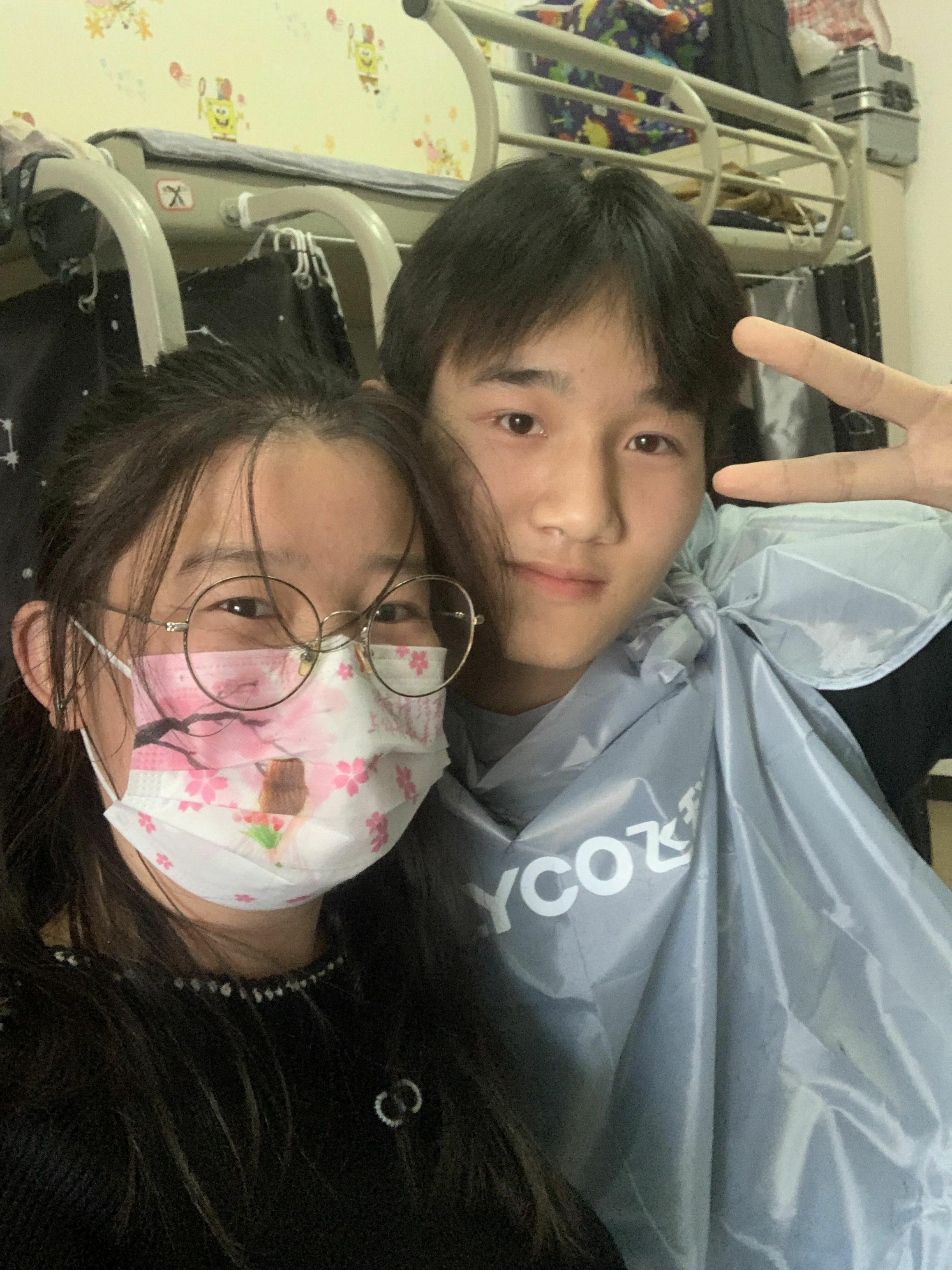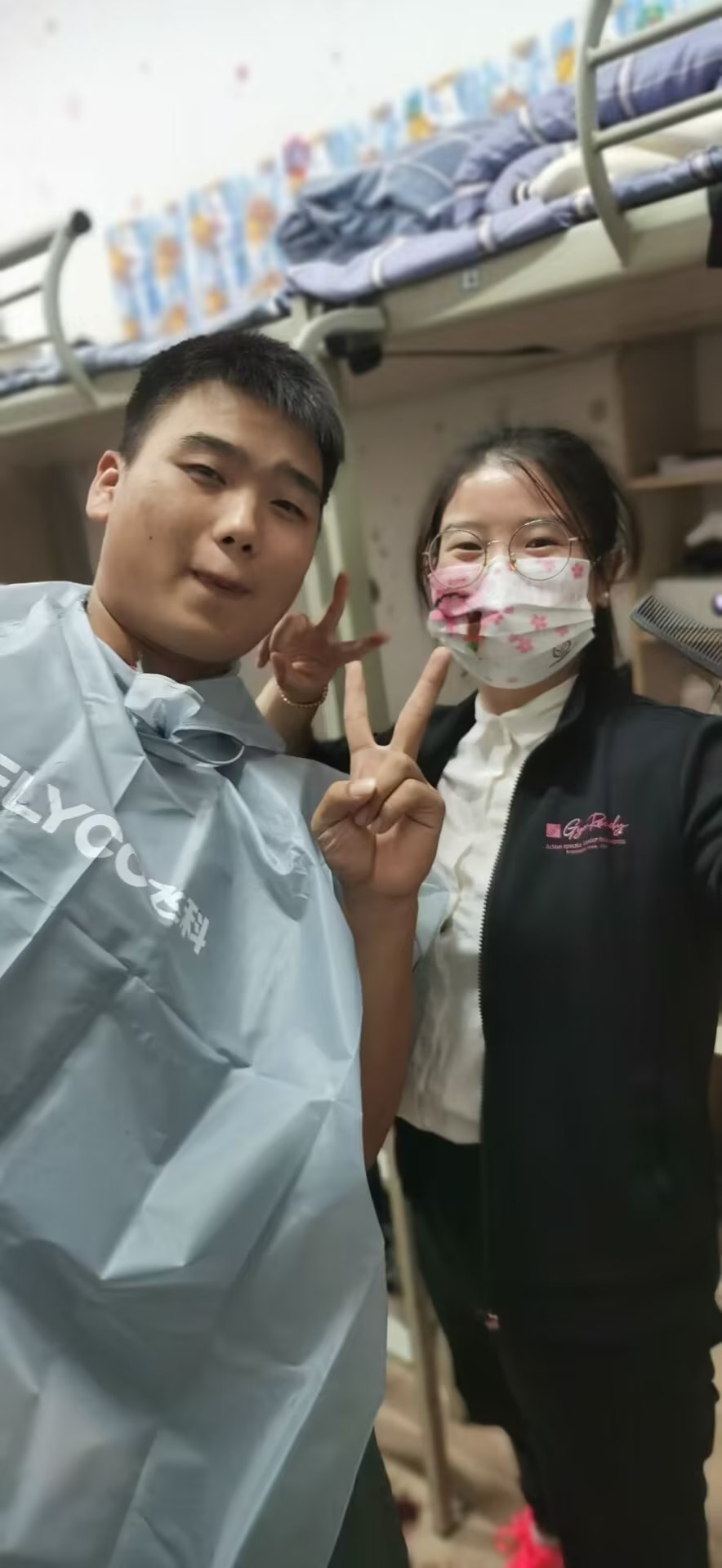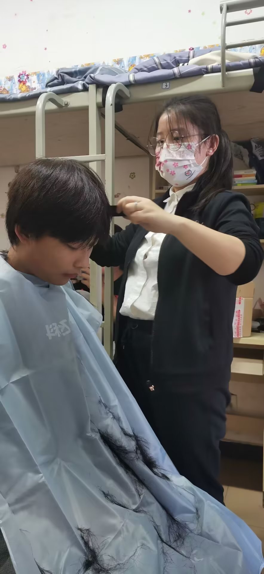 电推剪、发剪、梳子、围布……高春月老师瞬间跨行变身TONY高。“你把眼镜取下来,先闭上眼睛,小心碎发掉眼睛里”,虽然不及专业理发师,但老师亲力亲为,让原本同学们厚重的头发变得清爽干净,同学们也越来越喜欢这个多才多艺的辅导员。