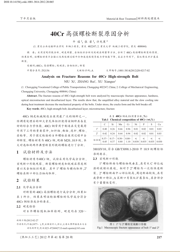 智能装备学院 实训设施 教科研成果 技师班平台 教科研成果首页 > 智能装备学院 > 教学科研 > 教科研成果 > 论文《40Cr高强螺栓断裂原因分析》 来源:教科研成果发布时间:2018-01-09 15:23访问量: 论文《40Cr高强螺栓断裂原因分析》,牛喜、张睿、许先果,《热加工工艺》2012年第41卷第20期。