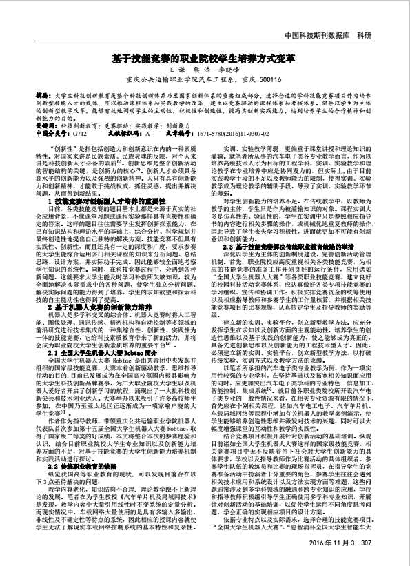 智能装备学院 实训设施 教科研成果 技师班平台 教科研成果首页 > 智能装备学院 > 教学科研 > 教科研成果 > 论文《基于技能竞赛竞赛的职业院校学生培养方式变革》 来源:教科研成果发布时间:2018-01-09 15:37访问量: 论文《基于技能竞赛竞赛的职业院校学生培养方式变革》,王谦、熊浩、李晓峰,《科研》2016年第11期。