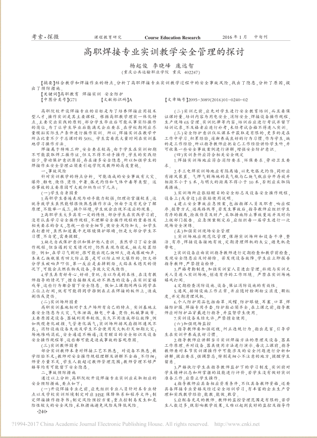 智能装备学院 实训设施 教科研成果 技师班平台 教科研成果首页 > 智能装备学院 > 教学科研 > 教科研成果 > 论文《高职焊接专业实训教学安全管理的探讨》 来源:教科研成果发布时间:2018-01-09 15:41访问量: 论文《高职焊接专业实训教学安全管理的探讨》,杨起俊、李晓峰、庞远智,《课程教育研究》2016年第1期。