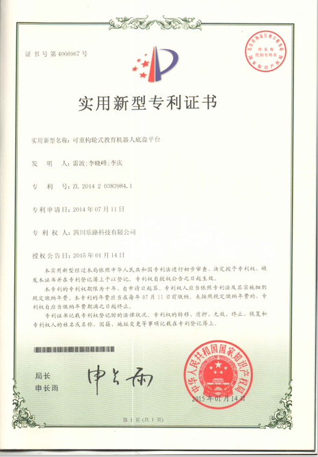 智能装备学院 实训设施 教科研成果 技师班平台 教科研成果首页 > 智能装备学院 > 教学科研 > 教科研成果 > 专利《可重构轮式教育机器人底盘平台》 来源:教科研成果发布时间:2018-01-09 15:44访问量: 专利《可重构轮式教育机器人底盘平台》雷波;李晓峰;李庆(专利号:ZL201420383984.1)