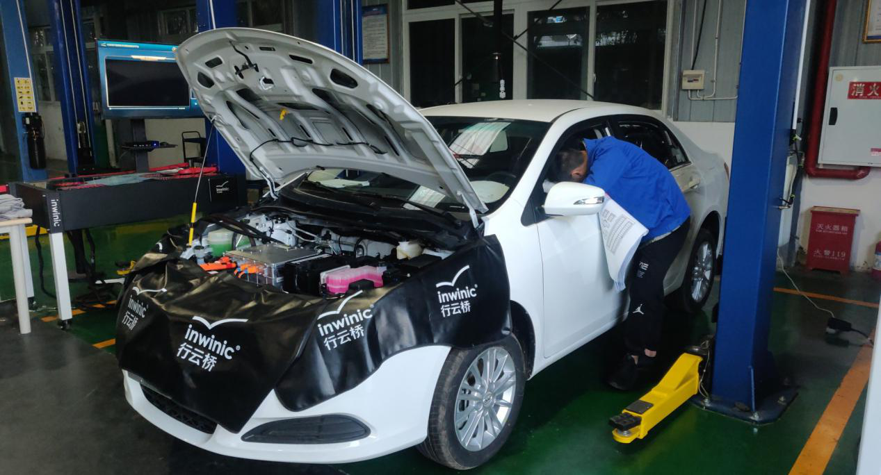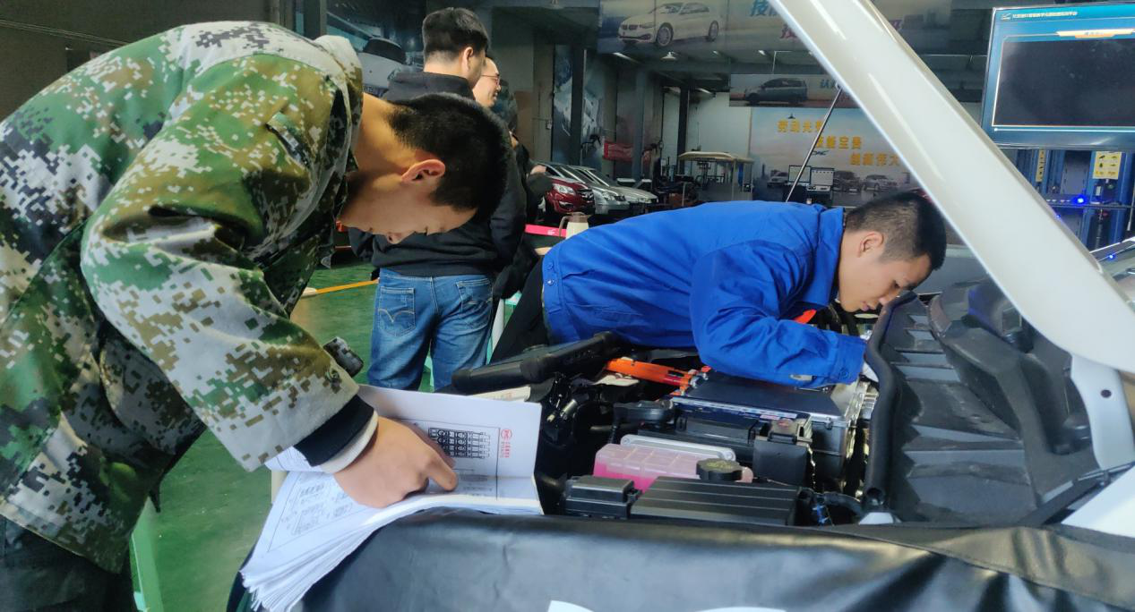 初进位于学院汽车实训基地一楼的实验室,不禁会为实训室里满地的电线头、材料碎片所惊讶。参赛选手邓朝炉不好意思地解释道,最近事情多,实在是太忙了。截至目前,2台参赛新能源汽车已基本安装到位,同时为了模拟正式比赛现场,队员们通过仪器进行排故障练习。