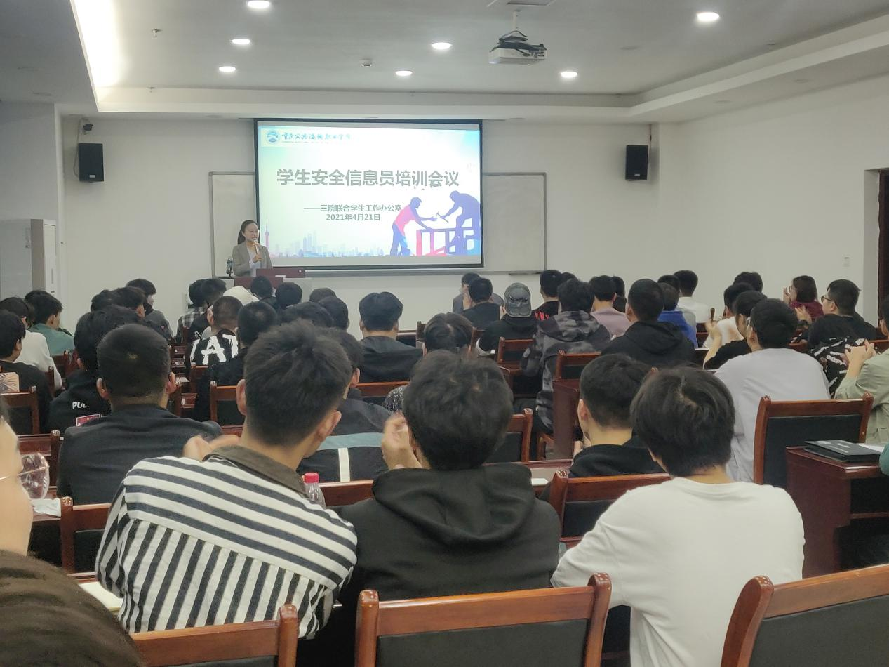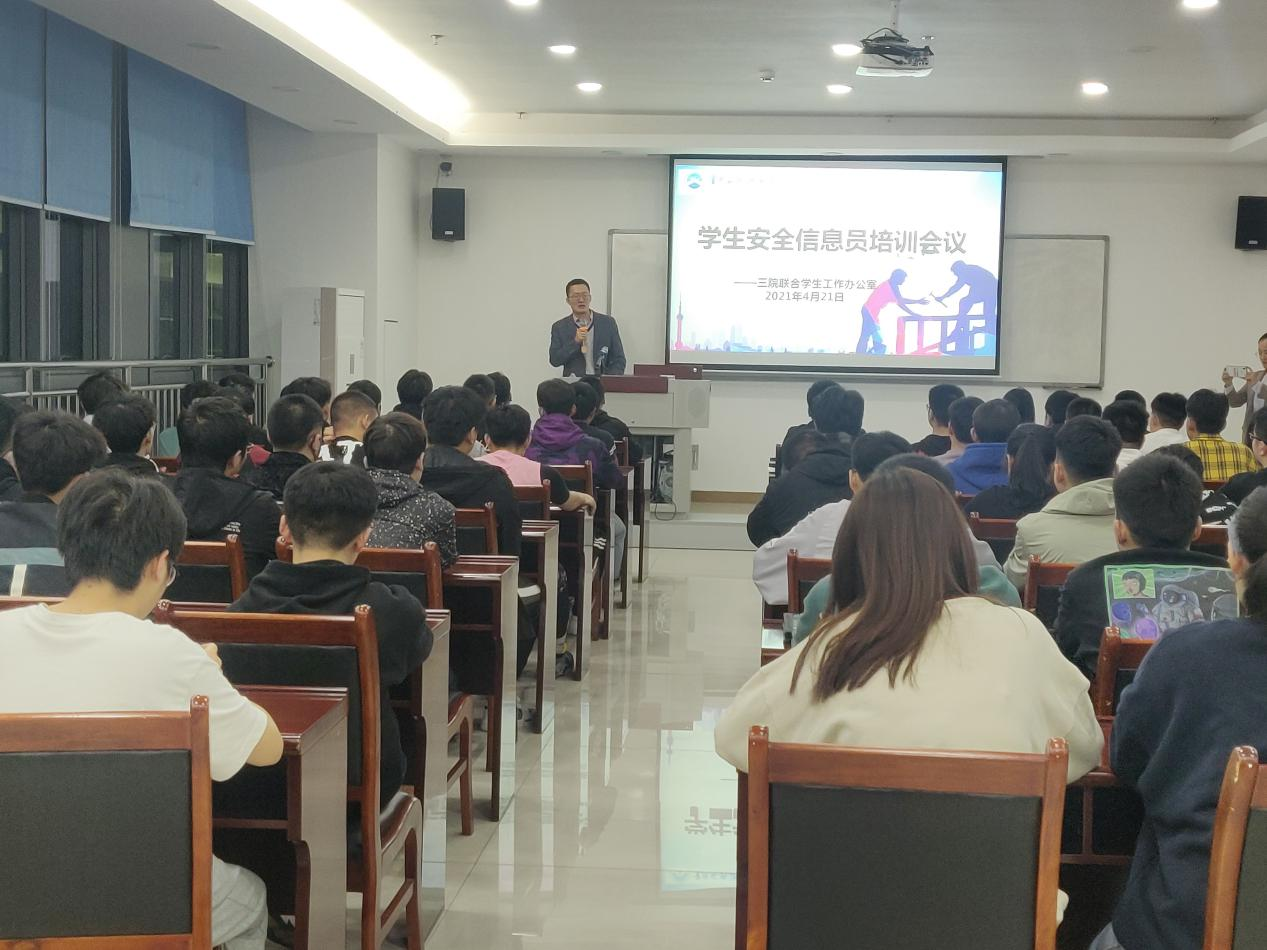 安全工作是学校工作的重中之重,是师生幸福安宁的保障,是开展学校各项工作的首要前提。2021年4月21日(星期三)晚20:40,三院联合学工办在办公楼3楼会议室组织召开全体学生安全信息员专题培训,三院联合党总支书记、智能装备学院副院长张睿老师,三院联合学工办主任胥迅老师,三院联合团总支书记袁昊老师,铁道与建筑学院辅导员殷镭老师,公共管理学院辅导员潘勇老师及全体学生安全信息员参会。