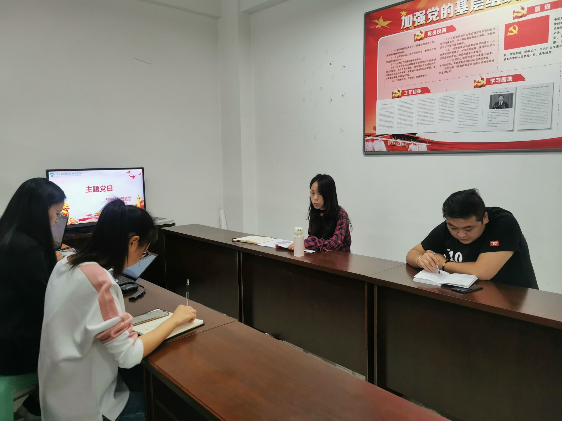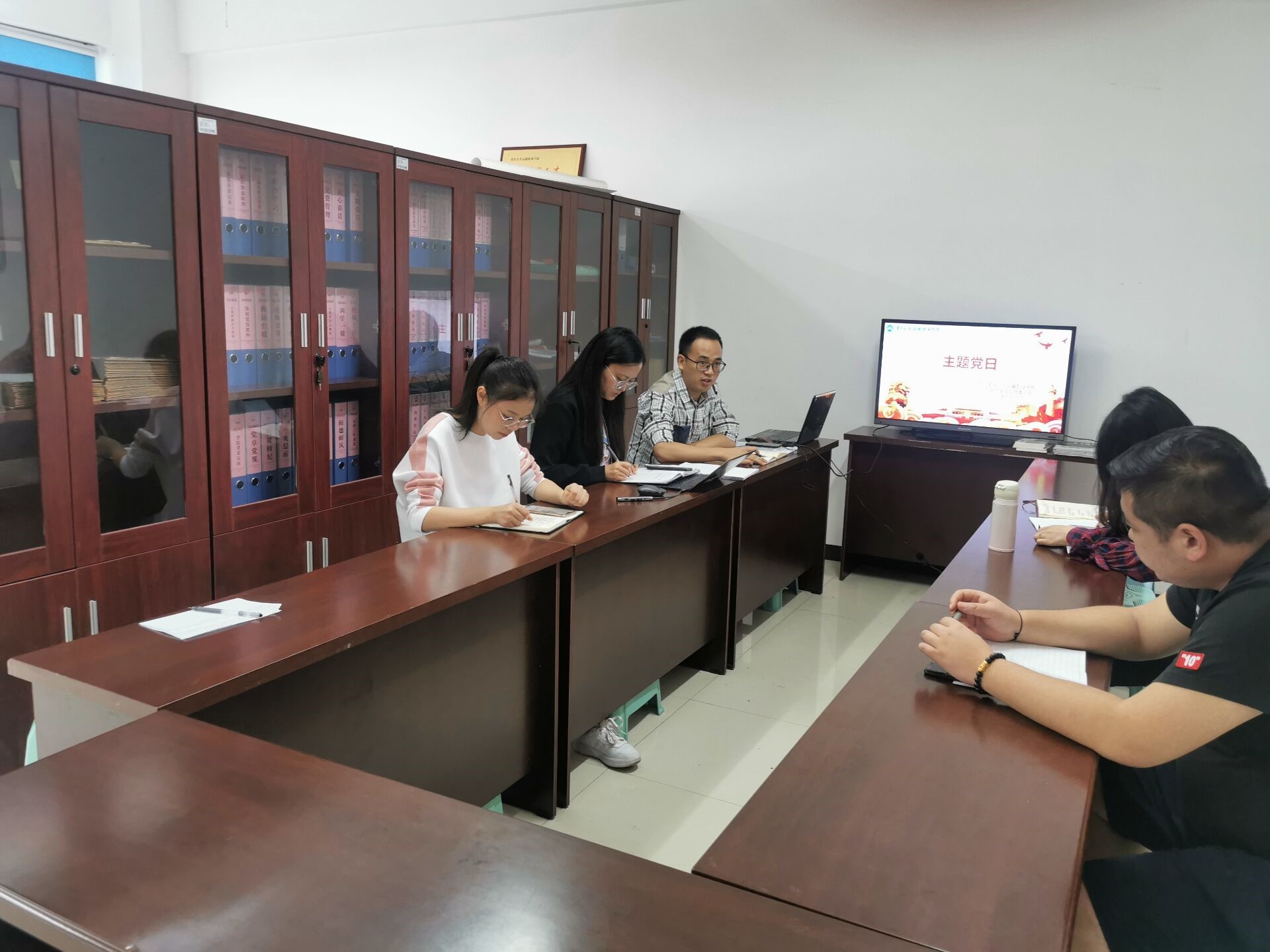 党支部书记胥迅同志阐述了理论学习的重要性、作为教育工作者应“以心育心、以德育德、以人格育人格”,培养爱生如子的情怀与担当,同时激励支部全体党员要进一步增强自身的责任感、使命感和荣誉感。组织委员潘勇同志引导每一位教师甘于平凡,在平凡的岗位上脚踏实地、默默耕耘,让敬业与责任成为一种习惯。宣传委员殷镭同志主要强调要不断调整方法、反思不足;不忘初心、见贤思齐、锐意进取。团总支书记袁昊同志坚定信念要严于律己、起好模范带头作用,勇于担当作为,做党和人民满意的好党员、好老师。