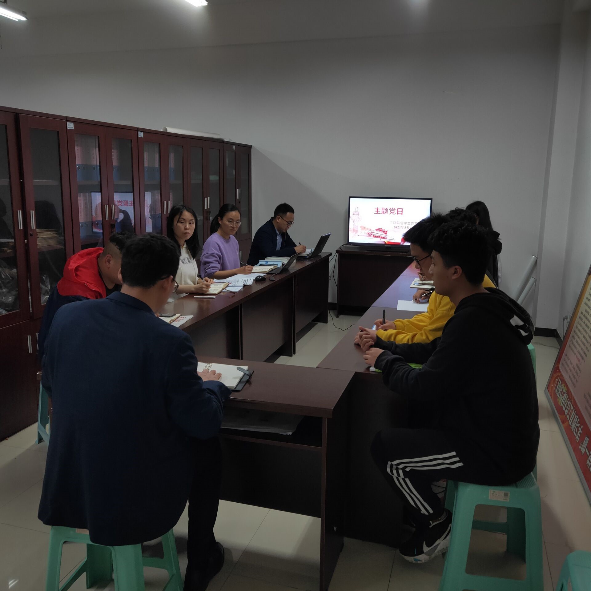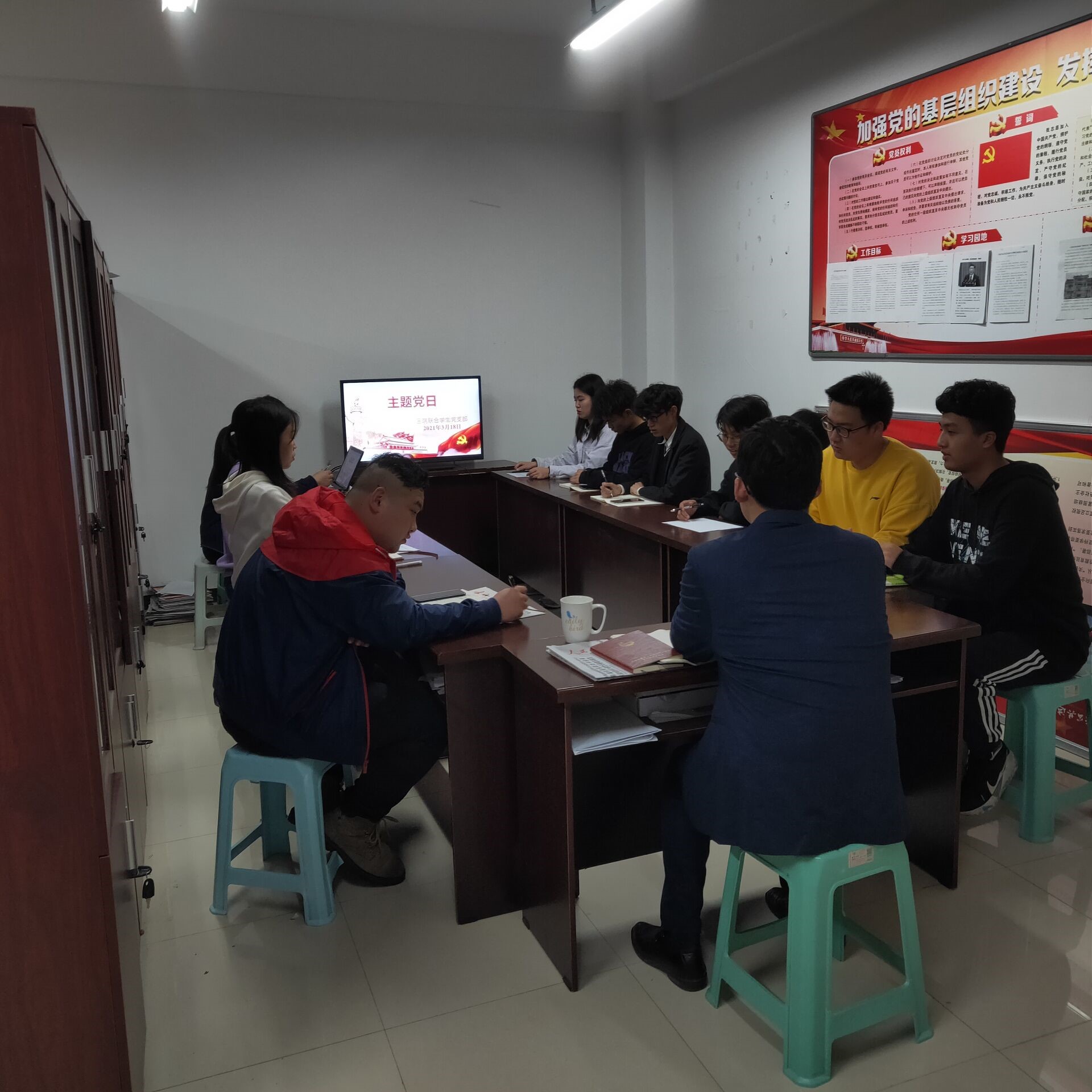 2021年3月18日星期四20:00,三院联合学生党支部在C301会议室开展了2021年3月主题党日活动,活动由三院联合学生党支部书记胥迅主持,全体党员和入党积极分子参会。围绕“弘扬雷锋精神,争做合格党员”主题,胥迅同志讲述了党史5个小故事,宣传委员殷镭领学了《中共中央关于加强党的政治建设的意见》、《关于巩固深化“不忘初心、牢记使命”主题教育成果的意见》、《中共中央关于授予周永开、张桂梅同志和追授于海俊、李夏、卢永根、张小娟、加斯来提.麻哈苏提同志“全国优秀共产党员”称号的决定》等文件精神。