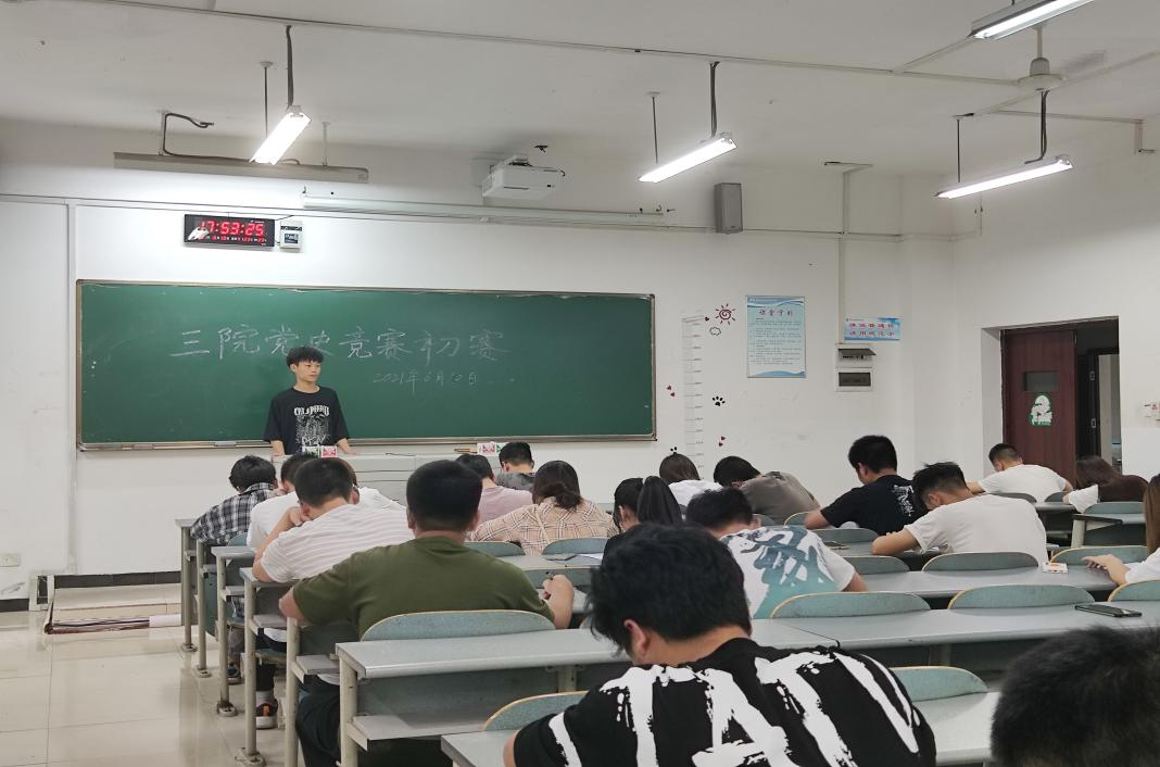 为扎实推进党史学习教育走深走实,营造浓厚的学习氛围,2021年6月10日下午17:50,三院联合学生党支部在主校区B104举办了以“知史爱党、知史爱国”为主题的党史知识竞赛初赛,来自三院联合各班组成的9支队伍,共计36人参加了竞赛。