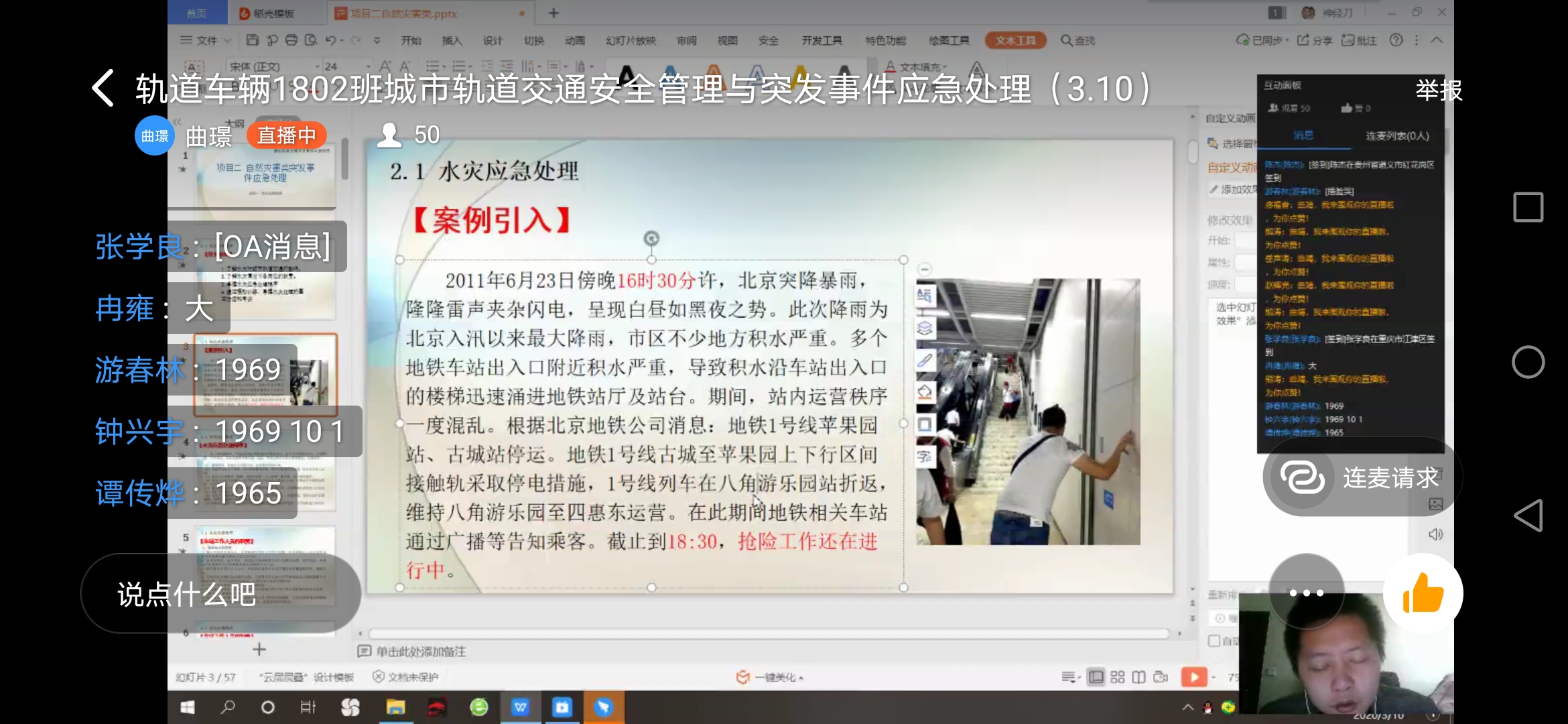 2.从每周巡课情况来看,大部分直播课程教学效果较好。随着“停课不停学”的不断深入,任课教师逐渐掌握了网络教学课堂节奏,讲课较之前更流利,备课更充分,部分教师课件使用了大量直观的图片进行辅助教学,引入企业实际案例等,同时课堂中还适时穿插了提问及互动环节。其中,曲璟老师在直播教学过程中全程开启视频,学生随时可以看到任课教师的授课状态,任课教师也可以通过屏幕随机抽取学生的形式,督促听课、记笔记、鼓励发言,这样既提高了同学的听课效率,也有效的进行了网络课堂管控;