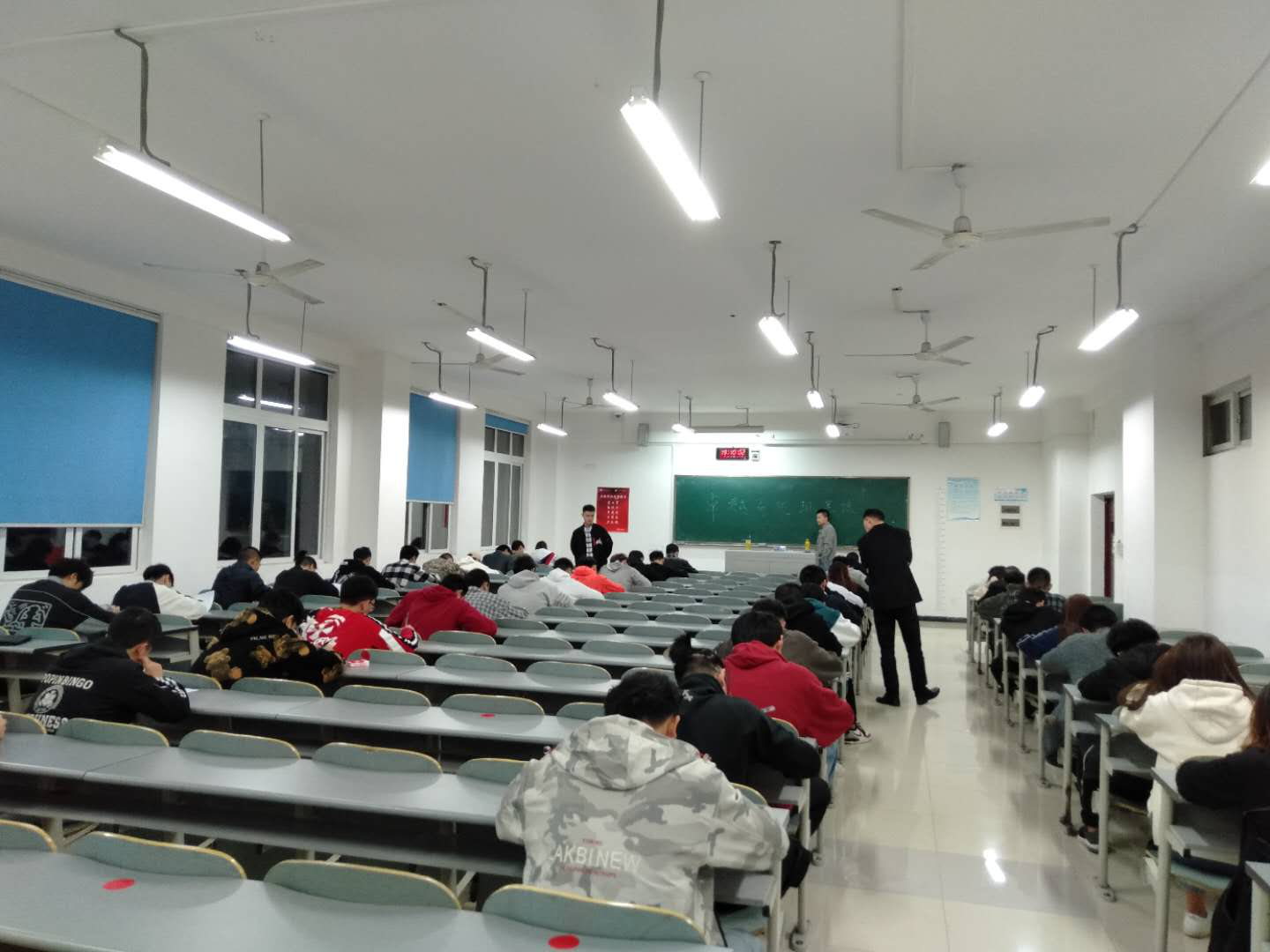 10月19日晚,进入笔试的100名学生分别在B104和B106进行笔试,4名系部专任教师和2名18级卓越司机班学生参与了监考工作。考试过程非常顺利,学生们秩序井然、遵守规则,无一人作弊,答题认真、严格要求自己,提交了一份自己满意的答卷。