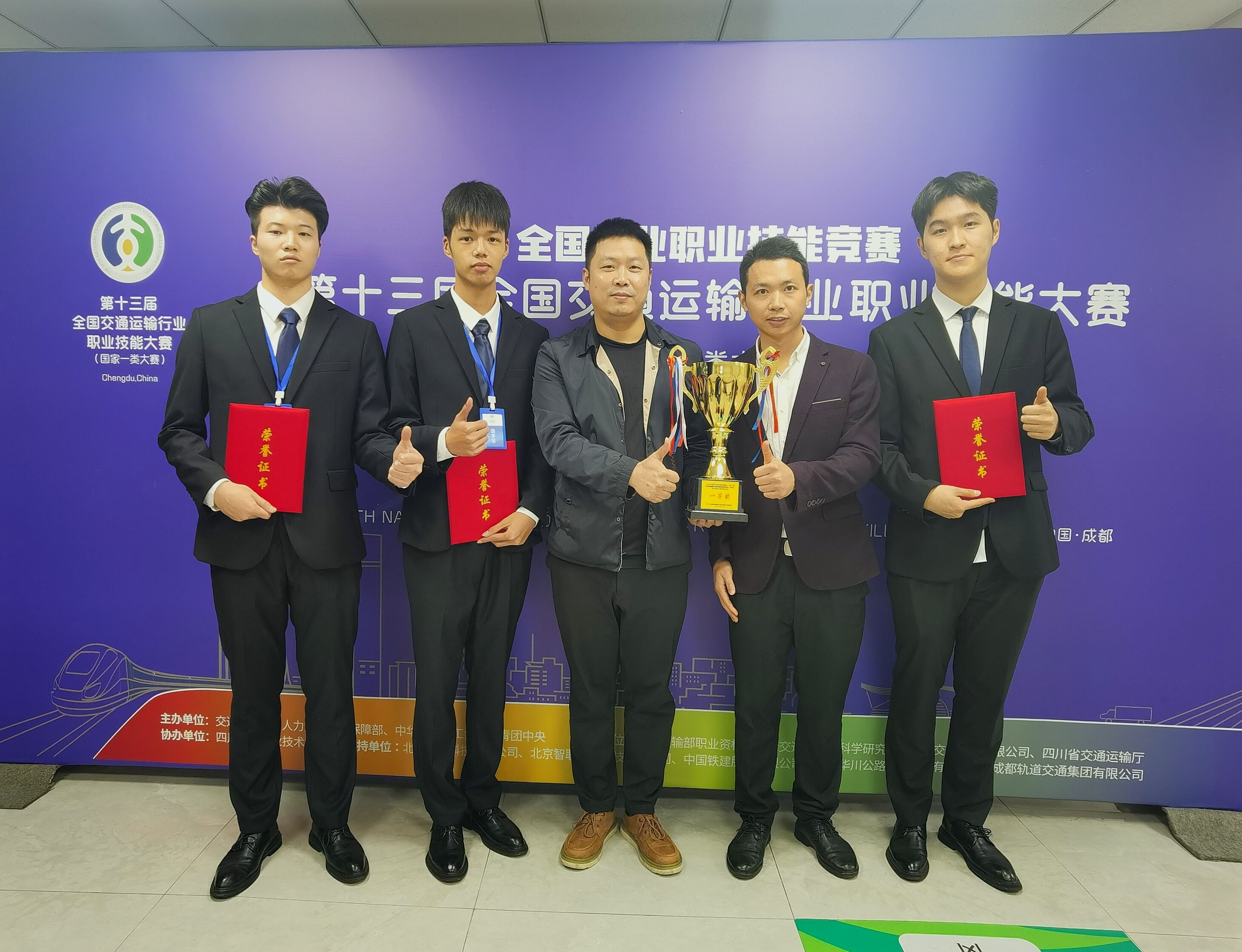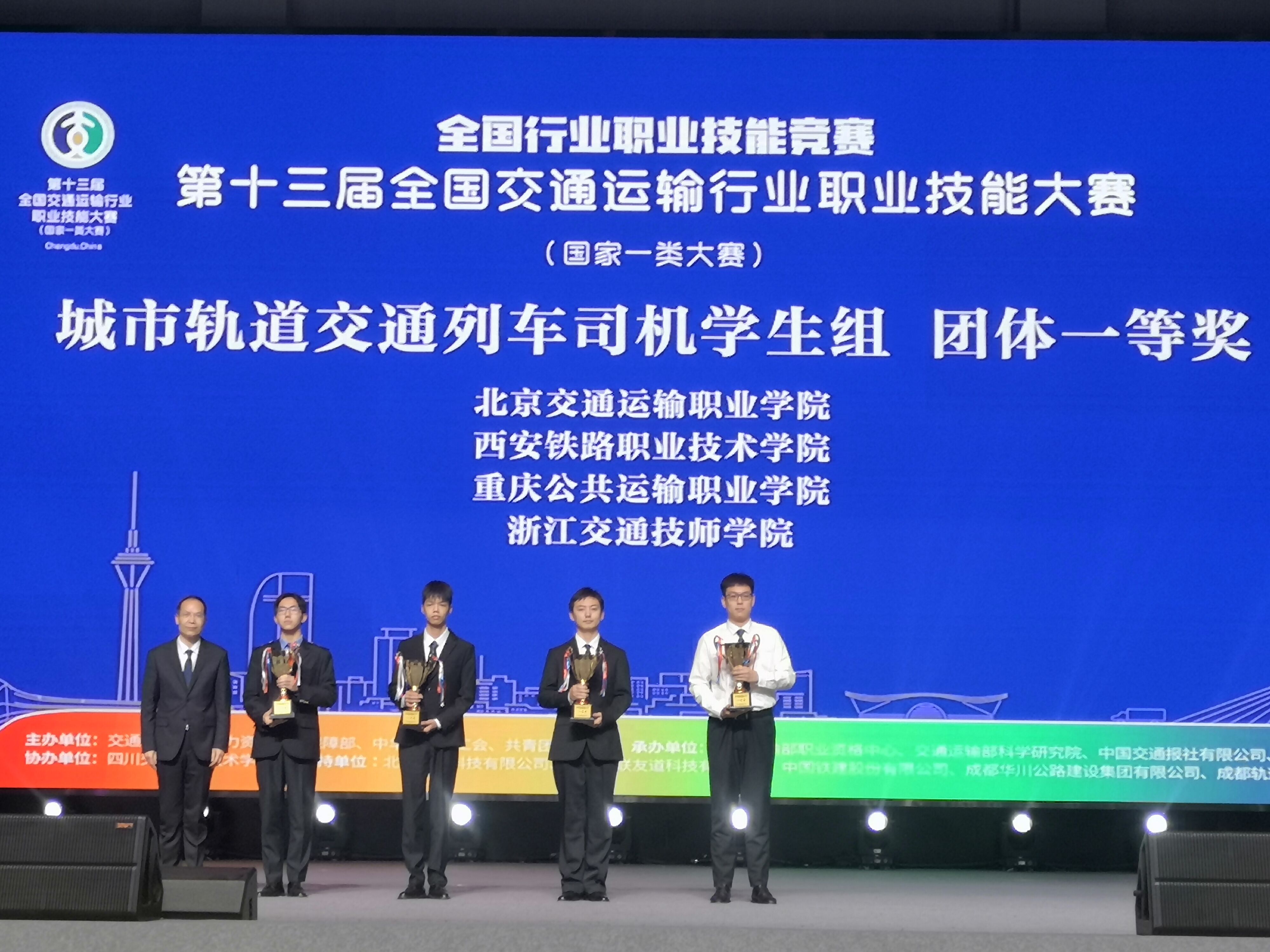 (第十三届全国交通运输行业职业技能大赛城市轨道交通列车司机赛项学生组团体一等奖 获奖者和指导教师合影) 据了解,学校对这次比赛高度重视,组织精干师资力量,依托校企共建的全国城轨与高铁技术共享实训基地等实训教学资源,指导参赛学生刻苦训练、积极备赛,为最终取得全国一等奖的优异成绩奠定基础。