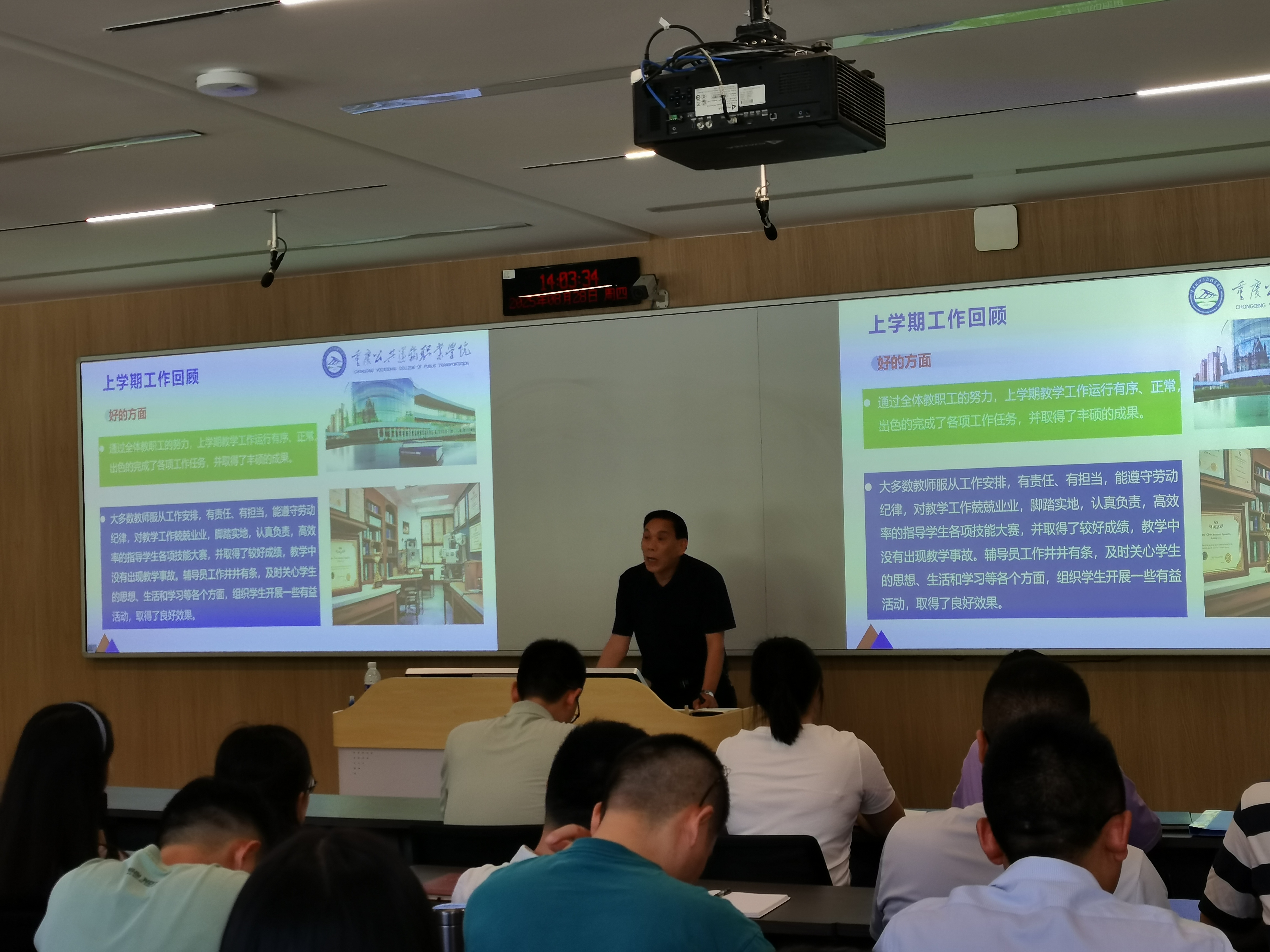 会上,彭院长回顾了上学期学院各方面取得的成果,同时也直接点出了存在的一些短板,强调这些问题将在新学期逐项整改。随后,彭院长提出新学期工作总思路:以服务学校高质量发展为目标,聚焦教师与学生两大主体,以深度产教融合为主线,以“五金”建设为引领,全力冲刺学校年度考核优秀A等。他还详细布置了开学前两周的重点工作,并细化了新学期教学工作任务,强调推进双高建设、持续开展“五金五讲”活动、强化师生技能大赛指导,做好日常教学及巡查、科研教改项目的申报与结题等工作。