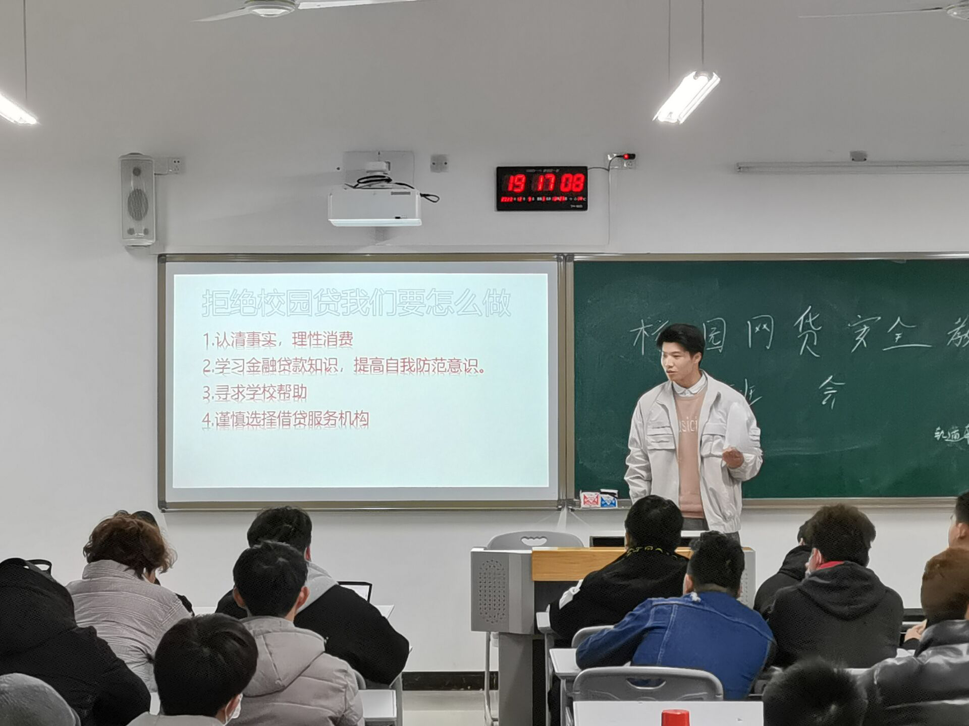 会上,班委陈凯和文浩龙,以校园贷真实案例,先后为同学们讲解了什么是校园贷,校园贷的特点及风险,让同学们具体了解了校园贷带来的伤害和影响。不断敲击同学们的警惕性、防患意识,增强同学们的防诈骗能力,引导同学们通过合法的手段维护自身的权益和财产安全。