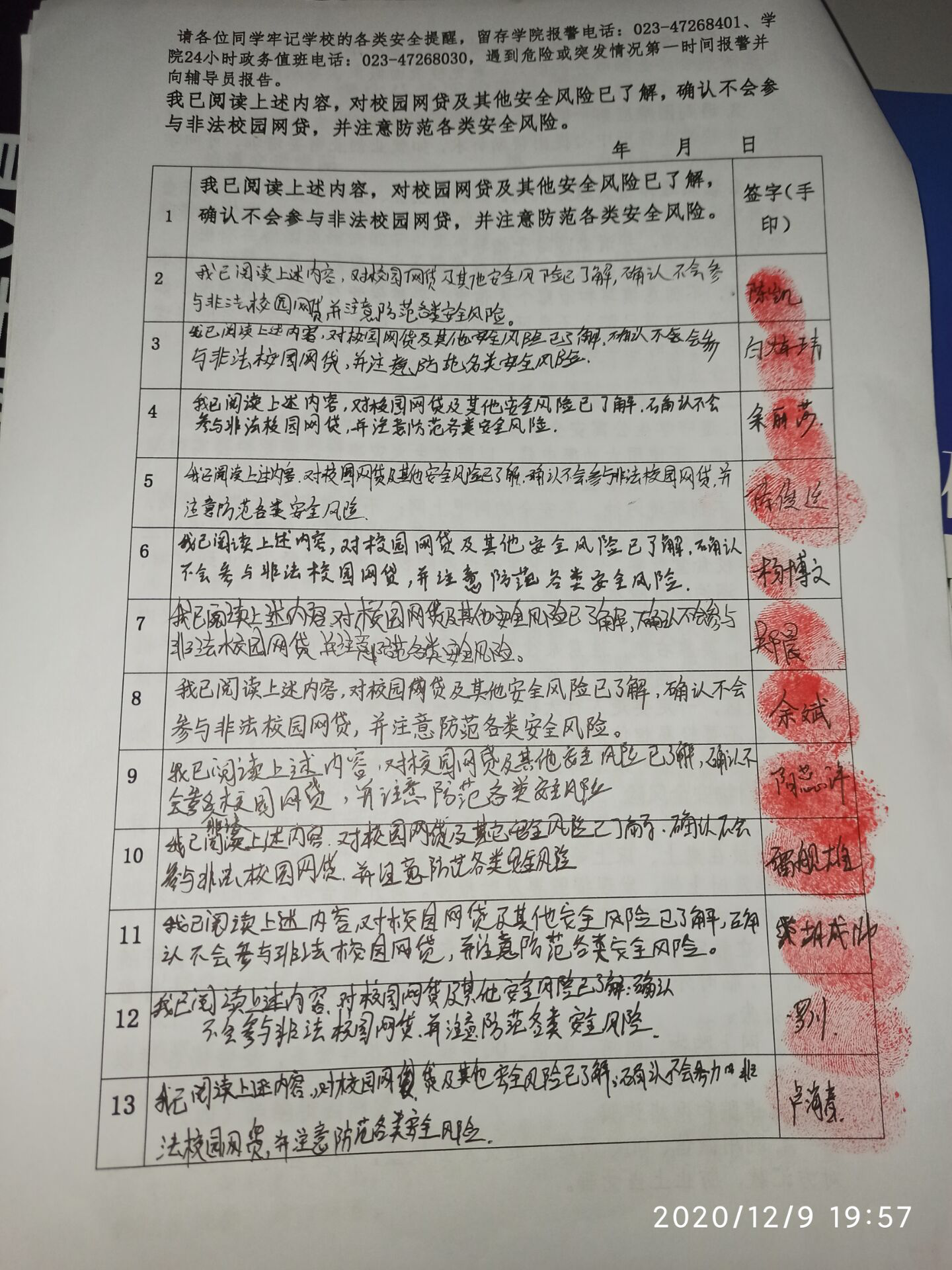 会后,全班同学一起签订了抵制校园贷的安全承诺书,为确保0校园贷事件发生安了一道有力的保险杠。