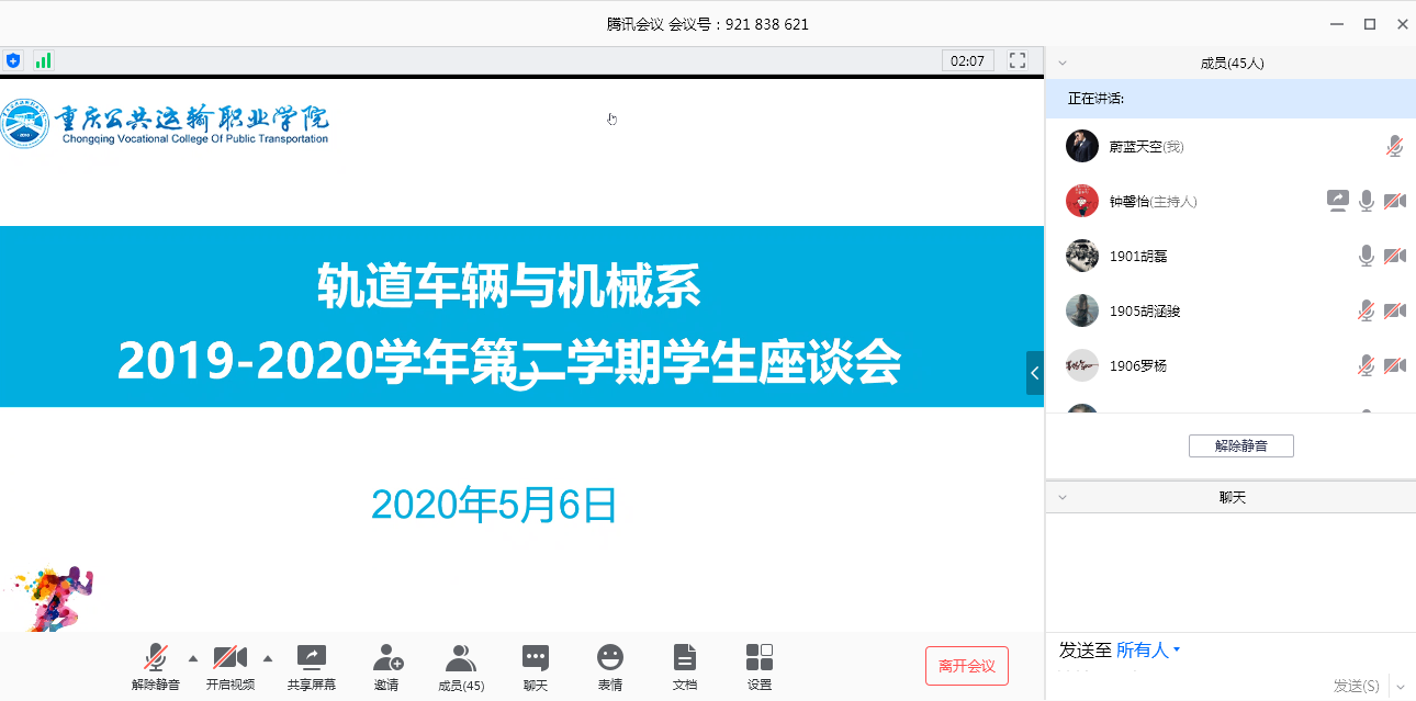 根据学院《关于开展2019—2020学年第二学期期中教学检查的通知》(渝运输职院教【2020】141号)文件精神,5月6日-8日,轨道车辆与机械系组织召开各年级各专业学生座谈会。轨道车辆与机械系主任易谷、副主任蒋晶,党总支副书记苏健康,部分教师代表、相关班级辅导员,2018、2019级共计40个班级学生代表参加了此次座谈会。