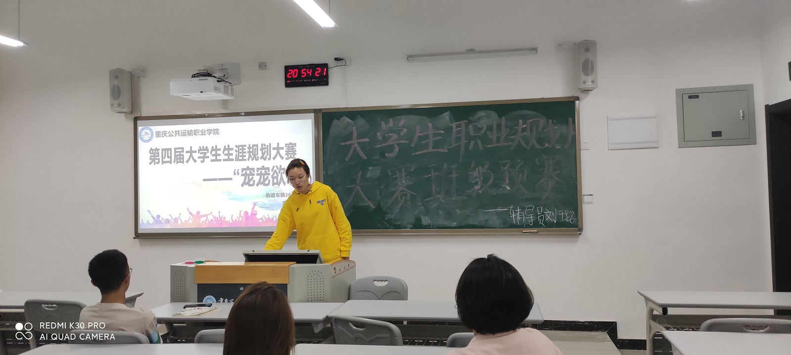 为切实加强就业教育,推进就业指导工作,帮助大学生明确学习和职业目标,树立正确的就业择业观念,根据学院统一安排,2021年4月24日晚上20:00,轨道车辆2001、2002、2003和2004班在新校区B405开展第四届大学生职业生涯规划大赛班级初选赛,初选赛由刘璐老师主持。 参与初选赛的四名选手通过PPT展示和演讲相结合的方式呈现自己的职业生涯规划,内容包含个人简介、自我认知、职业内容、目标定位和调整等方面。刘璐老师针对四名选手在台上的表现以及PPT演示的过程,提出存在的问题,并给每个同学提出演示礼仪、演示内容等方面的整改意见。
