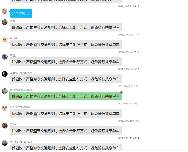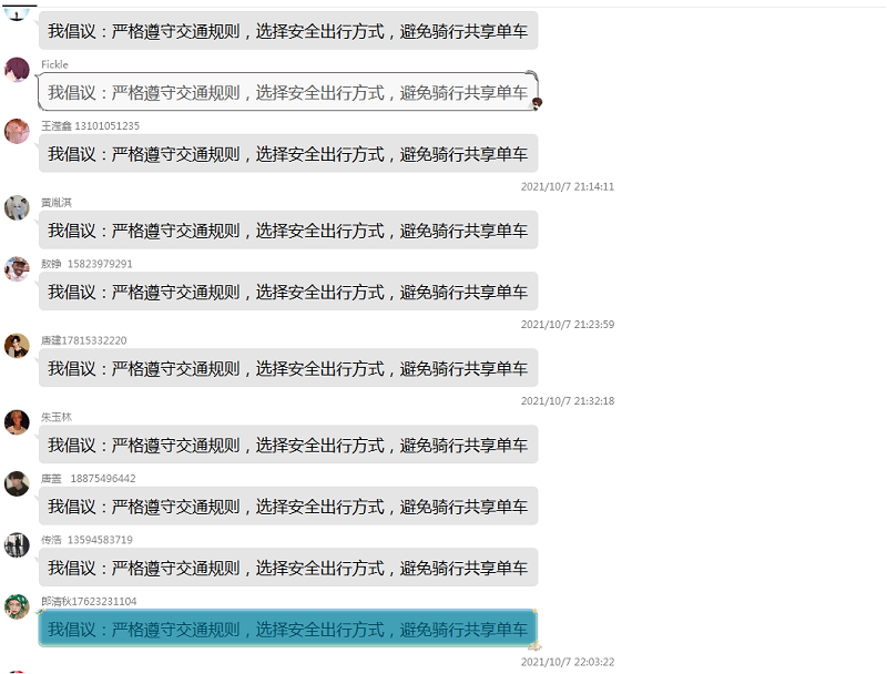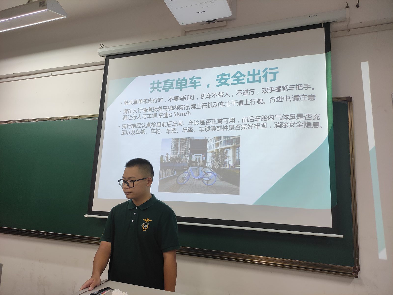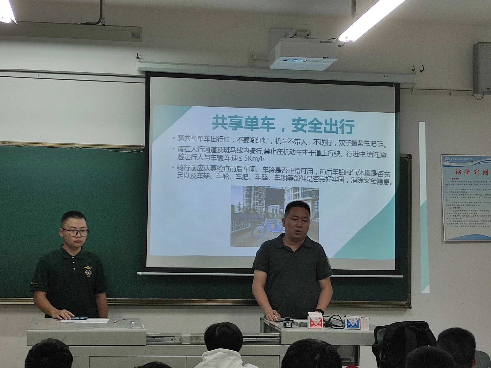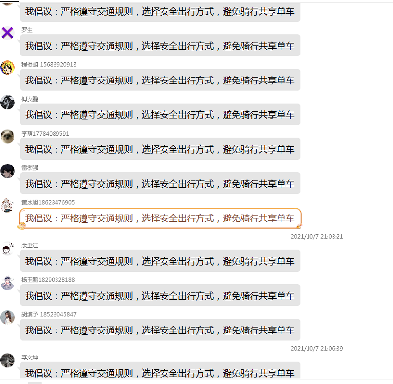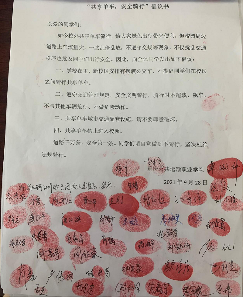 轨道交通学院 通知公告 创先争优 团学机构设置 学生活动 成果展示 学生活动首页 > 轨道交通学院 > 团学天地 > 学生活动 > 【主题教育】我院开展“共享单车,安全出行”安全教育主题班会活动 来源:学生活动发布时间:2021-10-11 17:34访问量: 现校外共享单车流行,给学生出行带了便利的同时,也给学生交通安全带来了极大隐患。为更好地提高学生交通安全意识和能力,10月7号起,结合学校要求,我院各班级陆续开展”共享单车,安全骑行”安全教育主题班会活动。 2019级各班级辅导员开展线上“共享单车,安全出行”文件解读,并在班级开展倡议活动。 2020、2021级各辅导员线下开展“共享单车,安全出行”主题教育班会,并签订安全倡议书。