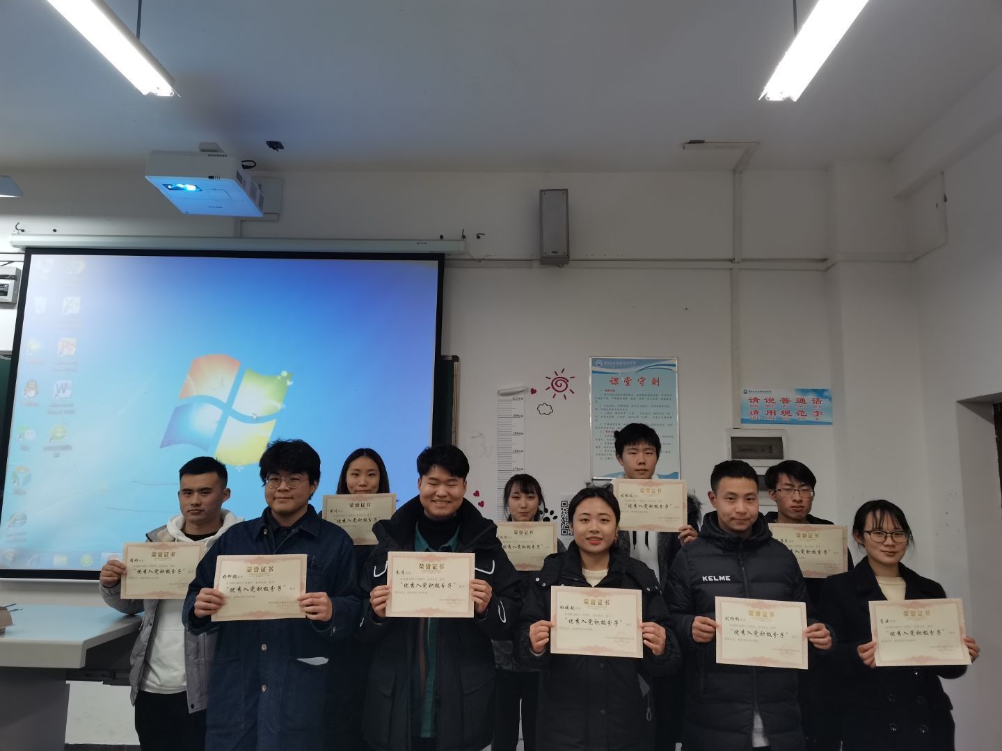 杨柳鹏、付柯楠、王宏等10名同学充分发挥模范带头作用,被授予“优秀入党积极分子”称号。黄川、朱月、周彬等8位同学在入党积极示范岗、党建进宿舍系列活动中严于律己从未缺席。授予“纪律创先争优示范岗”。