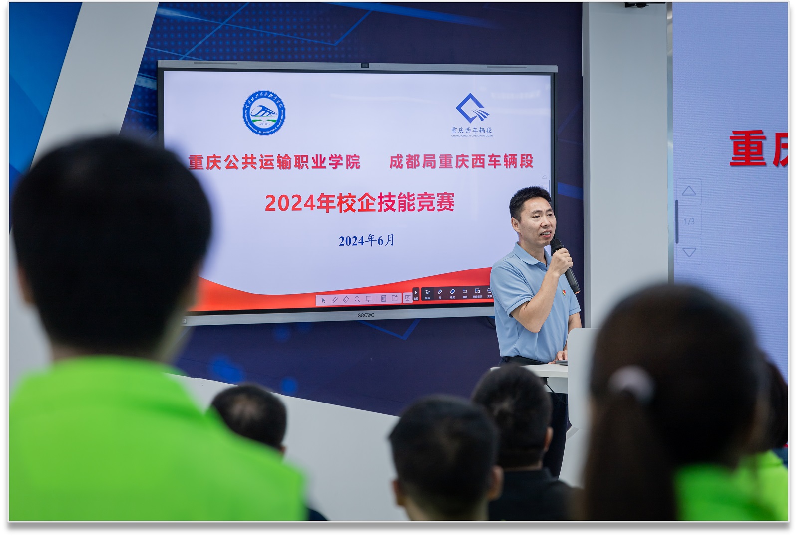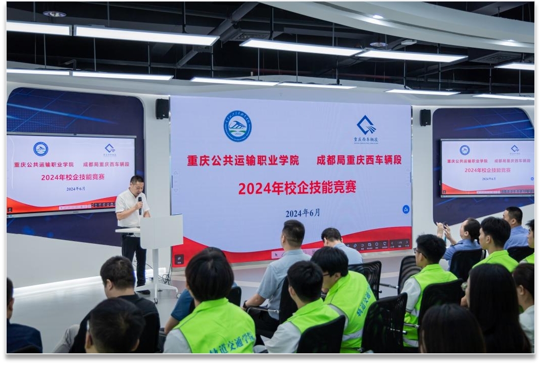 为贯彻落实党的二十大精神,大力培养高素质技能人才,助力发展新质生产力,6月25日,轨道交通学院教师党支部在学校科学城主校区虚拟仿真实训基地,与中国铁路成都局(集团)有限公司重庆西车辆段联合开展2024年校企技能竞赛特色主题党日活动,党支部党员教师充分发挥模范带头作用,积极参加技能竞赛,展示风采。
