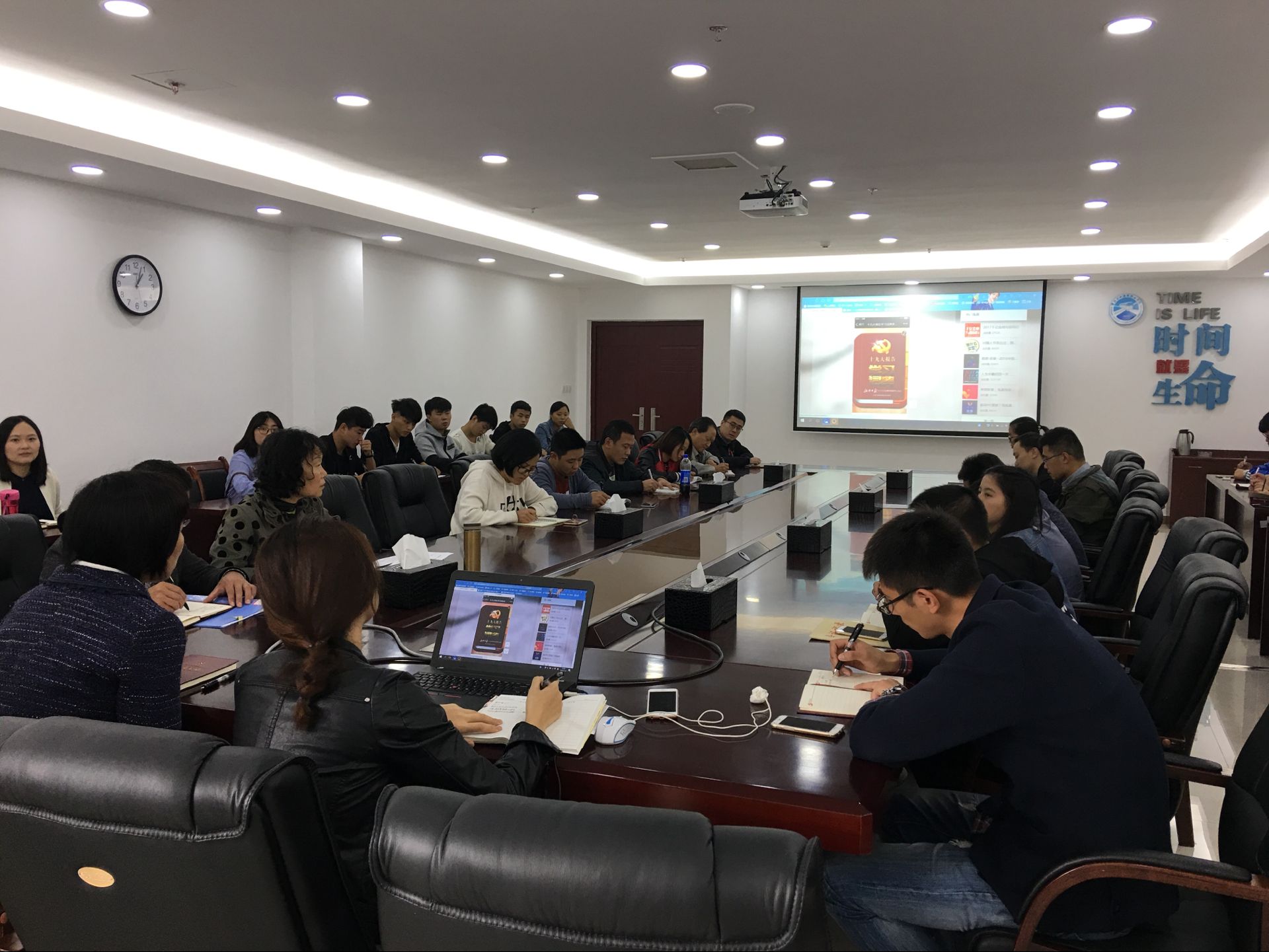 学习前,首先由学院彭超书记就十九大的总体精神及学院发展概况进行了总体概况,重点强调各位党员应认识到自己的责任和使命,将十九大精神落到实处,做好自身本职工作。然后,由曹琦老师通过PPT对整个十九大会议精神展开梳理,内容包括当代使命、新时代五个定位、主要矛盾、四个伟大、四个自信、一个重要思想、八个明确、十四个基本方略、七个战略、千年大计、新的奋斗目标、二个阶段、二个重要时期、适应新时代要求的新举措、九个方面政策指导、新时代党的建设总要求、坚持党要管党、从严治党、防止和反对八个主义、夺取反腐败斗争压倒性胜利、八个执政本领等方面。随后,学生党员及积极分子就十九大精神中对自己启迪最深的地方展开发言,接着,凃吉江、徐欢、石维林、廖贞星、苏健康等老师结合十九大精神对自己未来工作的开展进行了发言。最后,丁晓莹书记提出希望大家能够自觉学习十九大精神,努力做到将理论落地生根。