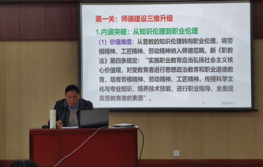 2025年4月2日中午13:00,轨道交通学院在A403会议室举办“突破‘三关’锻造职教良师,提高教师专业核心能力”专题讲座,学院全体教职工参会。此次讲座由彭克发教授担任主讲人,主要围绕师德建设、教学能力提升及产教融合三大核心议题展开,旨在打造“德技双馨”的高素质教师队伍,助力职业教育高质量发展。