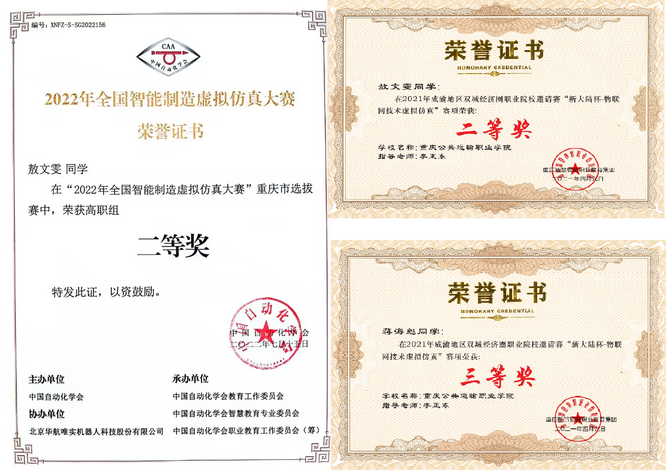 专业高度重视学生实践与创新能力培养,鼓励学生报考职业技能等级证书,并组建专业竞赛指导团队,带领学生参与全国职业院校技能大赛、交通行业技能竞赛等各级赛事。近年来,学生在“全国智能制造虚拟仿真大赛”“物联网虚拟仿真”等赛项中屡获佳绩,充分展现了学生扎实的专业功底与创新能力。