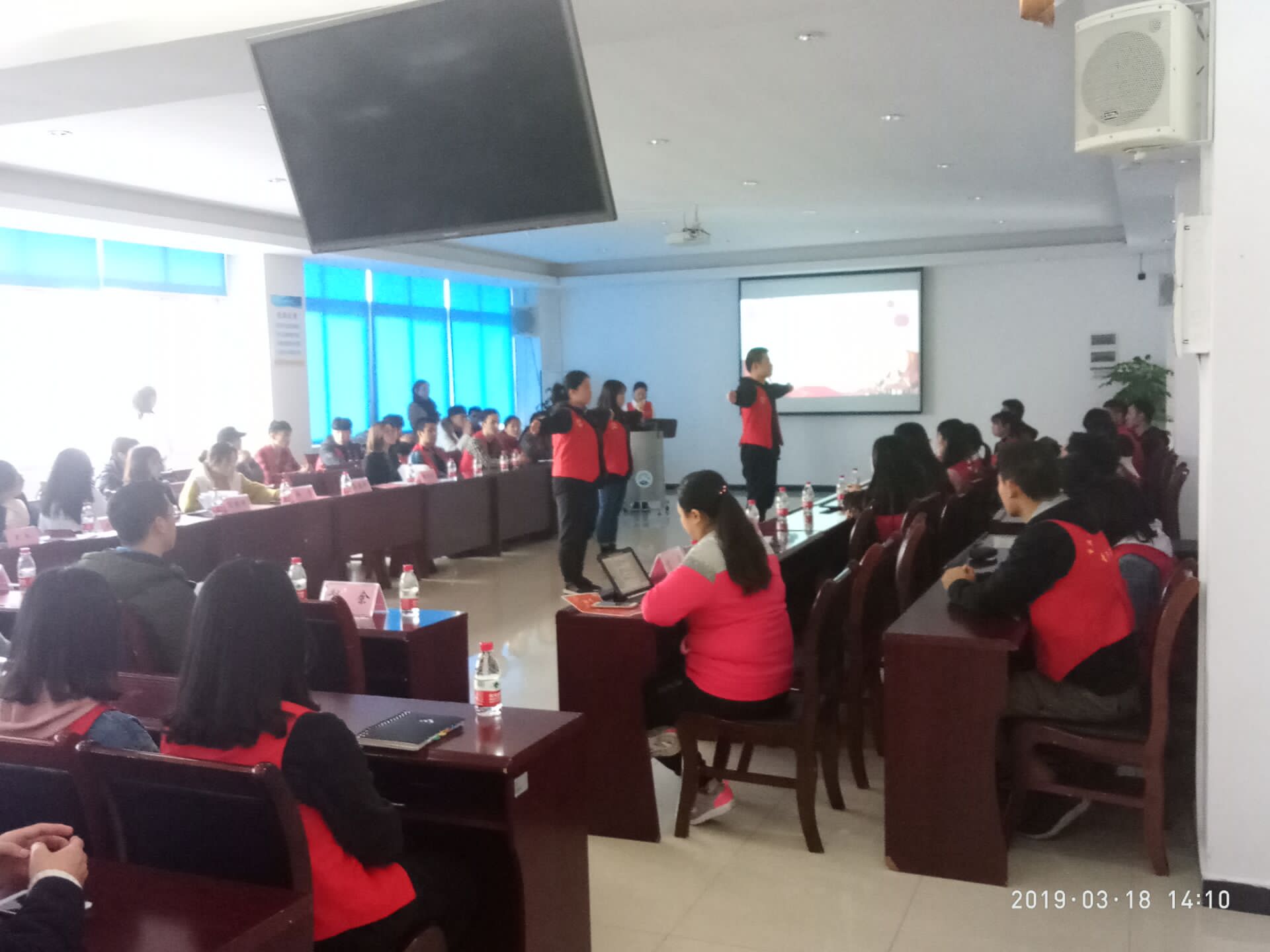 本次会议由金鑫同学担任主持人,参加本次会议的老师有:学生处处长刘妮娅老师、运输贸易系学工办主任古曼筝老师、轨道车辆与机械系学工办主任苏健康老师、轨道电气系学工办主任胥迅老师、三系联合学工办主任谭琳浩老师,轨道红马甲志愿服务活动带队郭真玲、袁延涛老师,学生处库国静老师,各系团总支书记、辅导员代表和轨道红马甲志愿者45人。