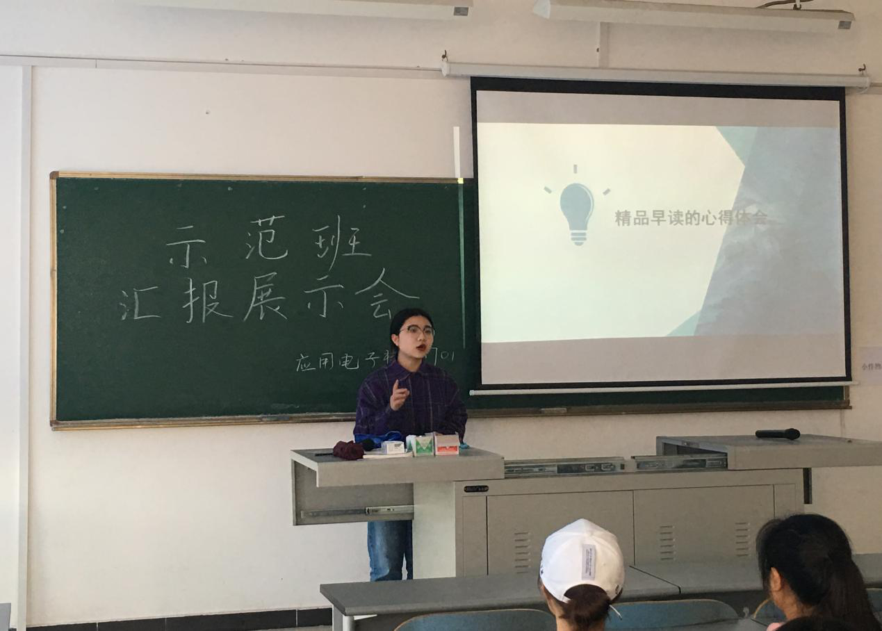 精品早读也是电子班的一大特色,同时更是将这一活动纳入了示范班的创建,从班级的学习委员黄星悦同学在分享组织策划过程中的感悟中,可以看出同学们的变化和成长,现在电子班的精品早读已经成为了系部精品早读活动的典范。