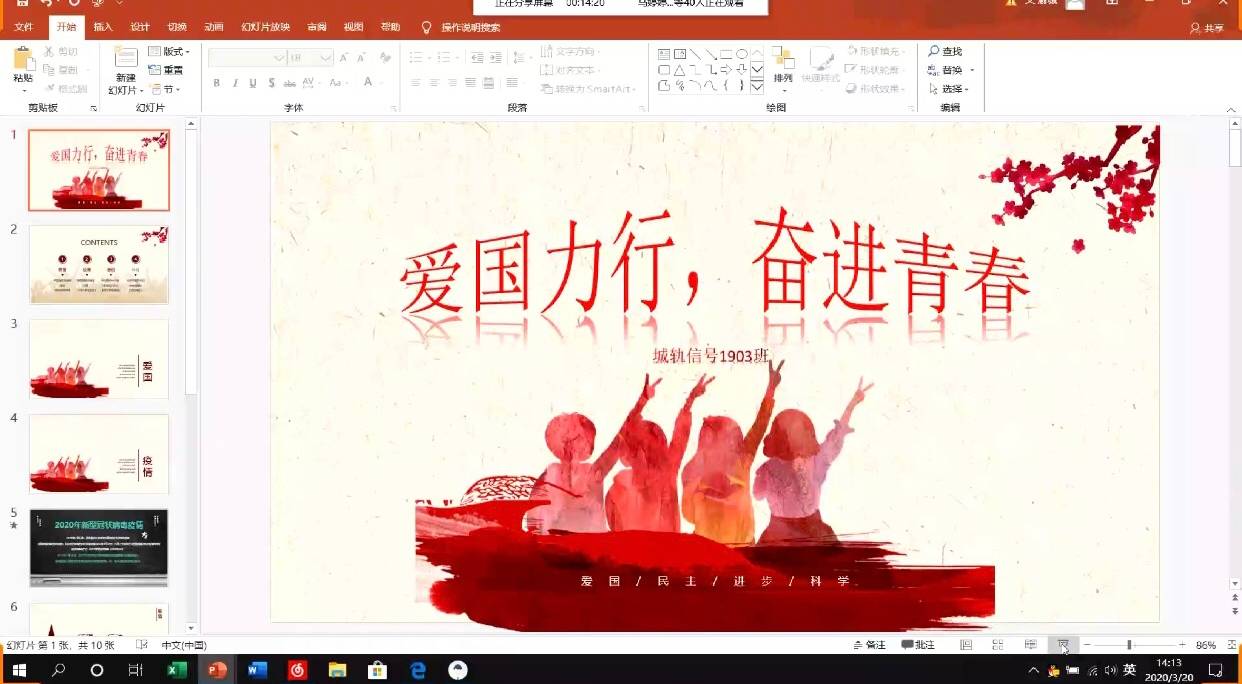 2020年3月20日,袁延涛老师组织城轨信号1903班在线上开展以“爱国力行,奋进青春”为主题的精彩主题班会。