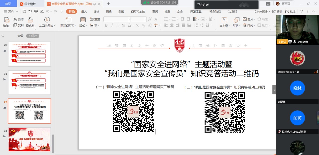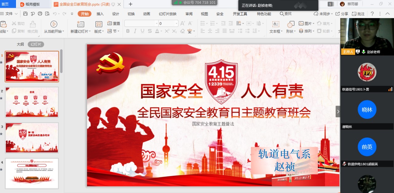 4月15日是我国“全民国家安全教育日”。为将国家安全融入学生的日常教育活动中,使学生了解全民国家安全教育常识,保护国家安全,2020年4月15日上午8点,辅导员赵祯老师在腾讯会议组织轨道电气系应用电子1801、铁道供电1801、铁道供电1802、铁道信号1801班开展了“国家安全、人人有责”主题教育班会活动。