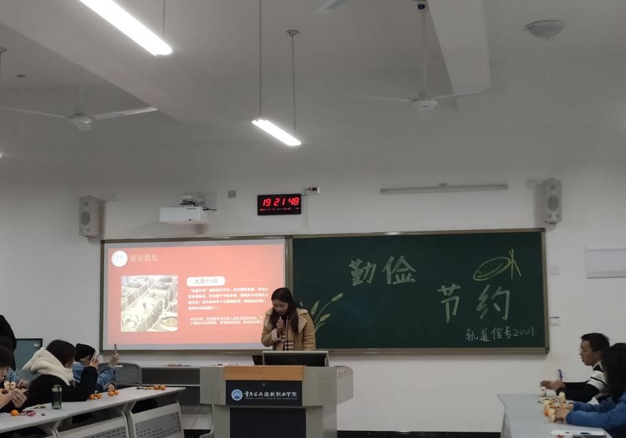 勤俭节约是我们中华民族的传统美德,更是优秀品质的表现。2020年12月2日晚7点,智慧交通学院轨道轨道交通通信信号2001班在新校区A305,展开了主题为“理性消费•勤俭节约”的班会活动。本次班会围绕居安思危、万事万物来之不易以及加强对大学生理性消费的教育等几个内容,让同学们树立正确的价值观。