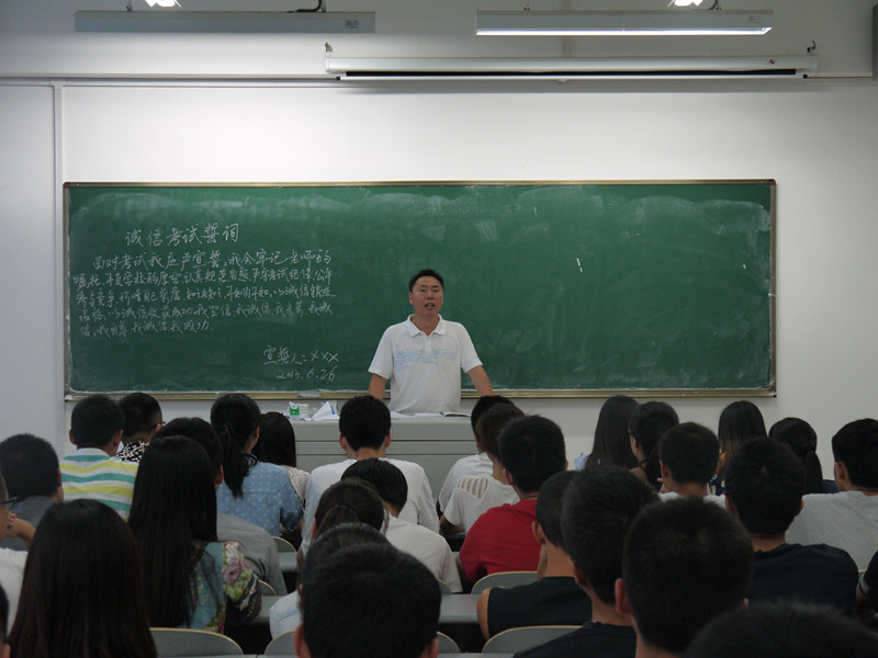 为了保证考试周的秩序稳定,6月26日我系召开了全体学生干部大会,唐春林主任强调了学生干部首先要带头诚信考试,并当场组织所有学生干部进行了诚信考试宣誓。接着各班先后召开期末考试动员大会,辅导员组织班上所有同学进行了诚信考试宣誓,从思想上为考生打“预防针”。有的班还组织学生在《诚信考试承诺书》上签名,以示自己诚信考试的决心。在考察课考试过程中,系里加强了考场巡查制度,对在考试舞弊违纪的学生进行了严肃处理,即该科成绩一律为零分,该生还要接受警告的违纪处分。并在校内张贴处分决定。由于措施得力,目前我系各门考查课的考试均已顺利结束,学生整体状况良好,现正在认真复习考试周的各门考试课程,准备以优异的成绩向家长和学院领导、老师汇报!