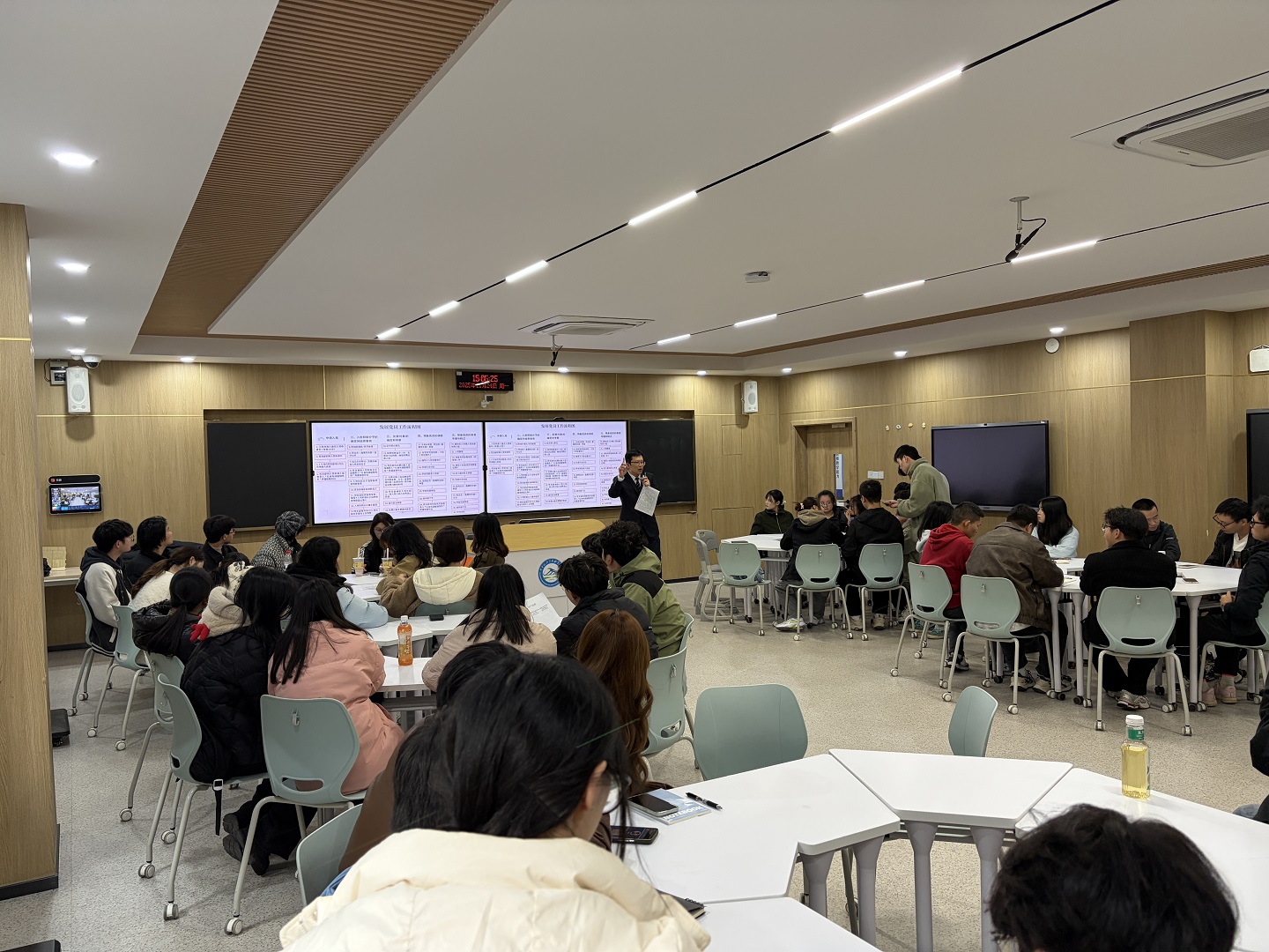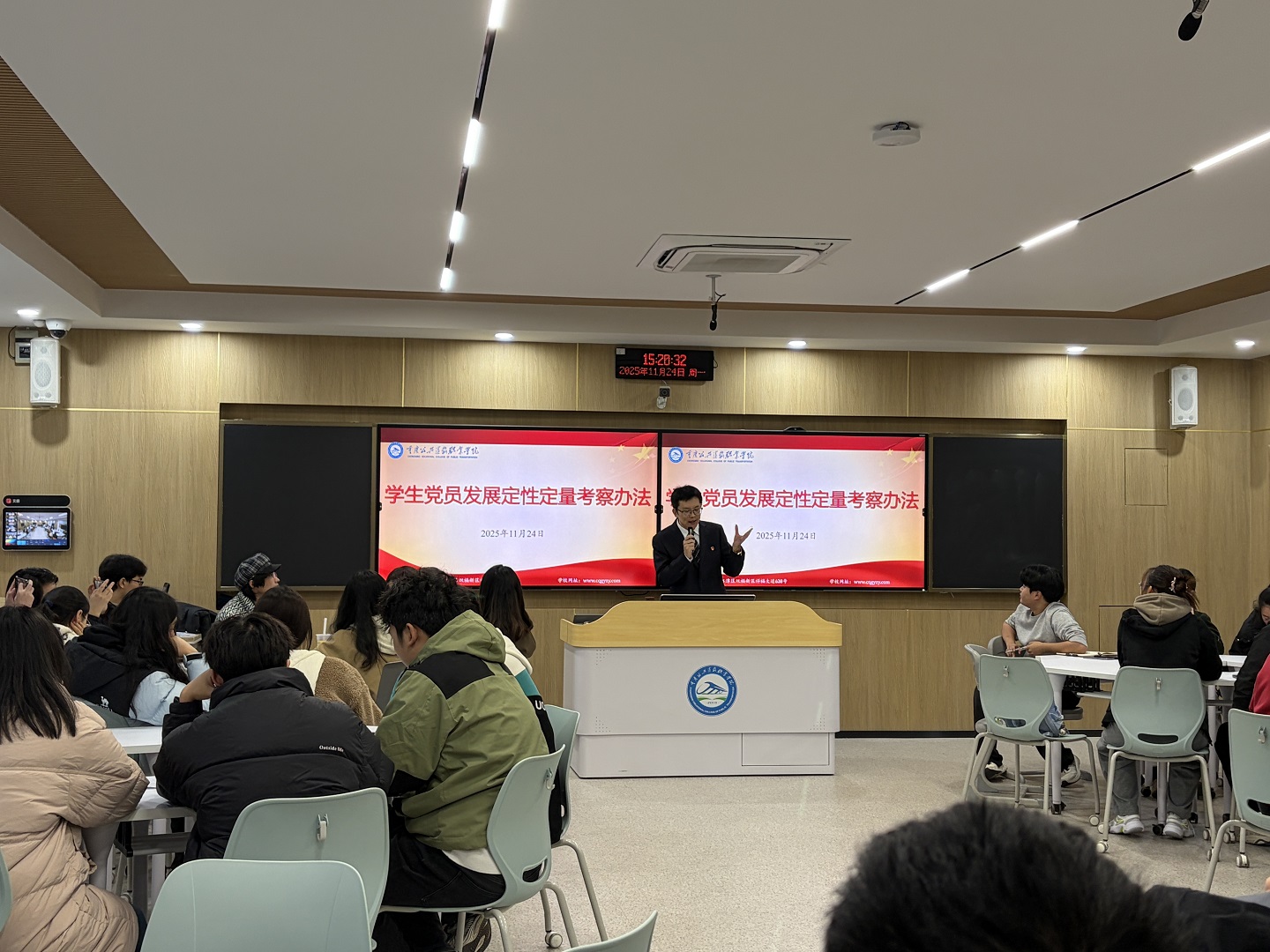 2025年11月24日星期一下午,智慧交通与铁建联合学生党支部组织委员陶平老师在主校区B206教室面向第24、25 期入党积极分子开展专题宣讲会。会议围绕入党程序讲解、发展对象人选量化考核解读、七号室友项目推进与经验分享三大核心板块展开,为63名入党积极分子明晰成长方向、压实服务责任。