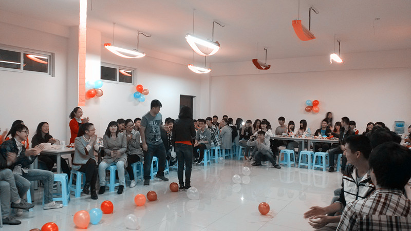 待同学们坐好后,晚会正式拉开帷幕。晚会的开场以运营班的《火》点燃了同学们的激情,接着便是两个班同学共同带来的小合唱、小品、武术、英文歌等精彩节目。为增强晚会气氛,晚会上穿插着一个个互动小游戏,例如“默契大考验”、“智慧大比拼”、“抢板凳”等。其间还有情歌对唱,拉近了两个班同学之间的距离、挑起了同学们的激情。在晚会接近尾声时,全场一起跳起了兔子舞,唱起了《朋友》,把气氛推向了高潮,我们的晚会伴随着歌声和一张张合影中落下了帷幕。
