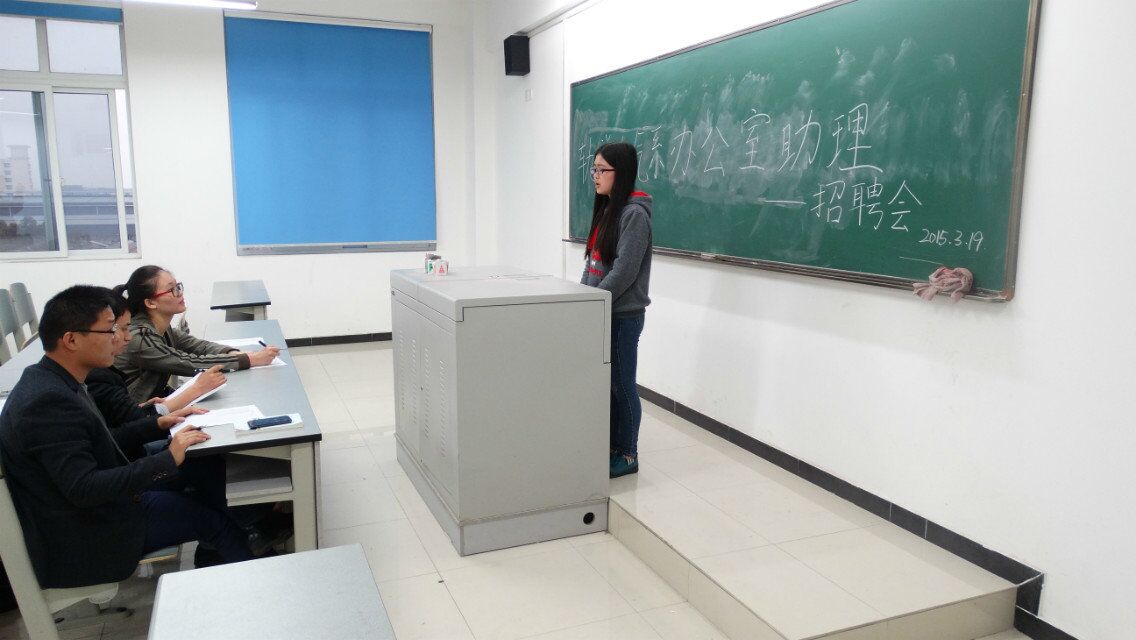 为增加同学们的锻炼机会,更好地协助老师们处理日常事务。2015年3月19日19时,轨道电气系于C406教室举行了系部办公室助理招聘会,共有近40名同学参加。同时,此次招聘会邀请到了邓勇老师、丁晓伟老师担任面试官。