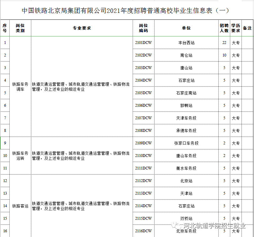 3.符合应聘岗位要求的学历、专业等条件(见附表),且在校期间所学专业方向为铁路专业方向、所学课程中包含铁路专业课程(北京生源、天津生源毕业生所学专业课程中包含铁路相近课程可报名申请应聘)。