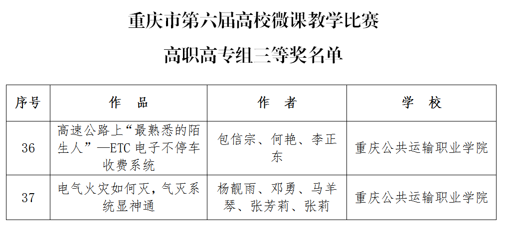 市教委近日公布重庆市第六届高校微课教学比赛获奖名单,重庆交通开投集团所属澳门正规电子游戏平台智慧交通学院榜上有名,获得高职高专组2个三等奖。