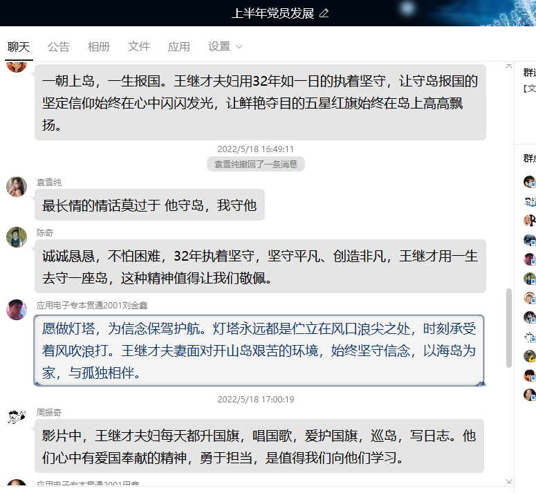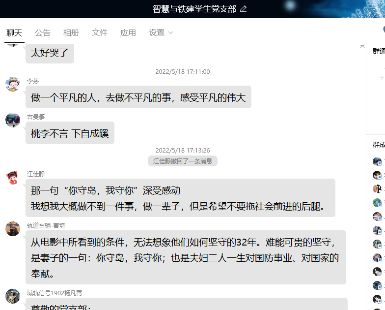 电影中王继才夫妇默默奉献、踏实工作、艰苦朴素的工作作风深深感染全体参会成员,大家无不为王继才夫妇的赤子情怀所动容,纷纷表示都将各自的岗位上坚守平凡,爱岗敬业、甘于奉献!