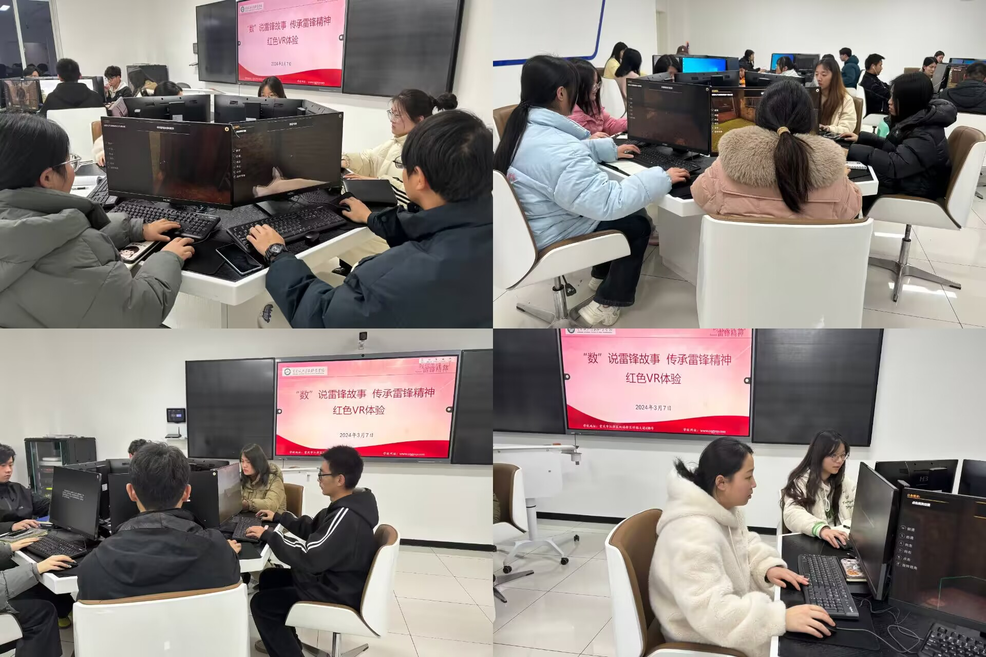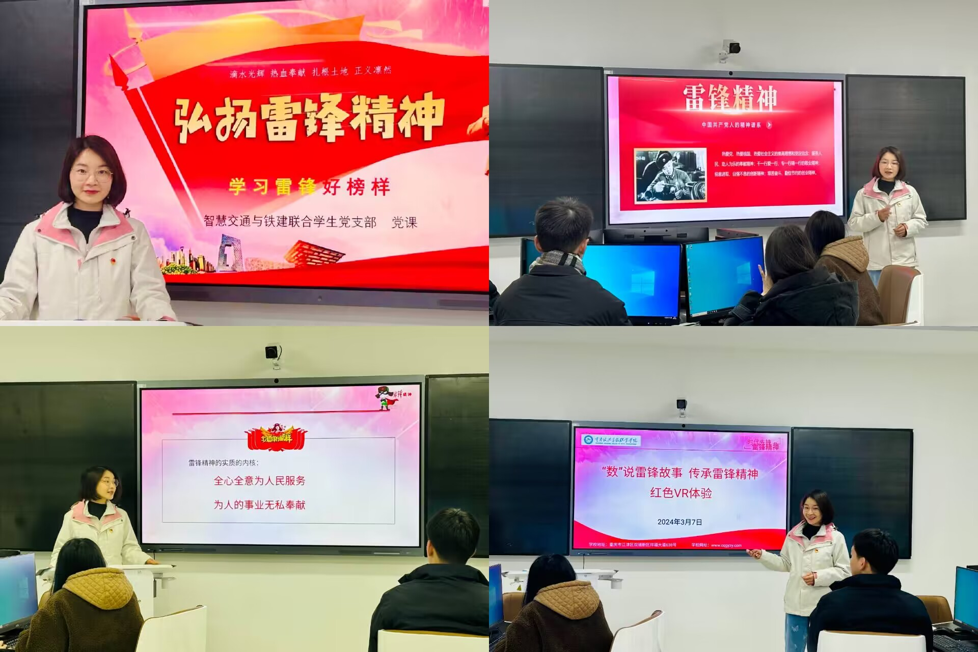 智慧交通学院 通知公告 党支部动态 学习园地 工会活动 党支部动态首页 > 智慧交通学院 > 党建动态 > 党支部动态 > 学生党支部开展“数”说雷锋故事,传承雷锋精神红色VR党课 来源:党支部动态发布时间:2024-03-11 10:39访问量: 为深入学习贯彻习近平总书记关于弘扬雷锋精神的重要论述,进一步深化拓展新征程上学雷锋活动形式载体,智慧交通与铁建联合学生党支部于2024年3月7日晚在B108人工智能实训室开展了“数”说雷锋故事,传承雷锋精神的红色VR党课。支部党员、积极分子代表、团员代表、“煜”班学生代表参加了此次活动。 此次党课,同志们从雷锋同志的幼年,少年,青年三个年龄阶段全方位体验了雷锋同志的成长历程,大家纷纷表示深受雷锋同志坚定不移跟党走,为国家为人民牺牲奉献的精神所震撼。此次党课为教育引导党员、青年团干部等进一步把握雷锋精神的时代内涵,坚定理想信念,发挥了重要作用。