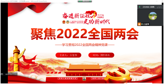 通过此次线上党课,引导全体党员聚焦全国两会热点,开展深入学习,将个人的理想价值融入到时代的发展和社会的需要,在学习、工作、生活中充分发挥好模范带头和引领示范作用。