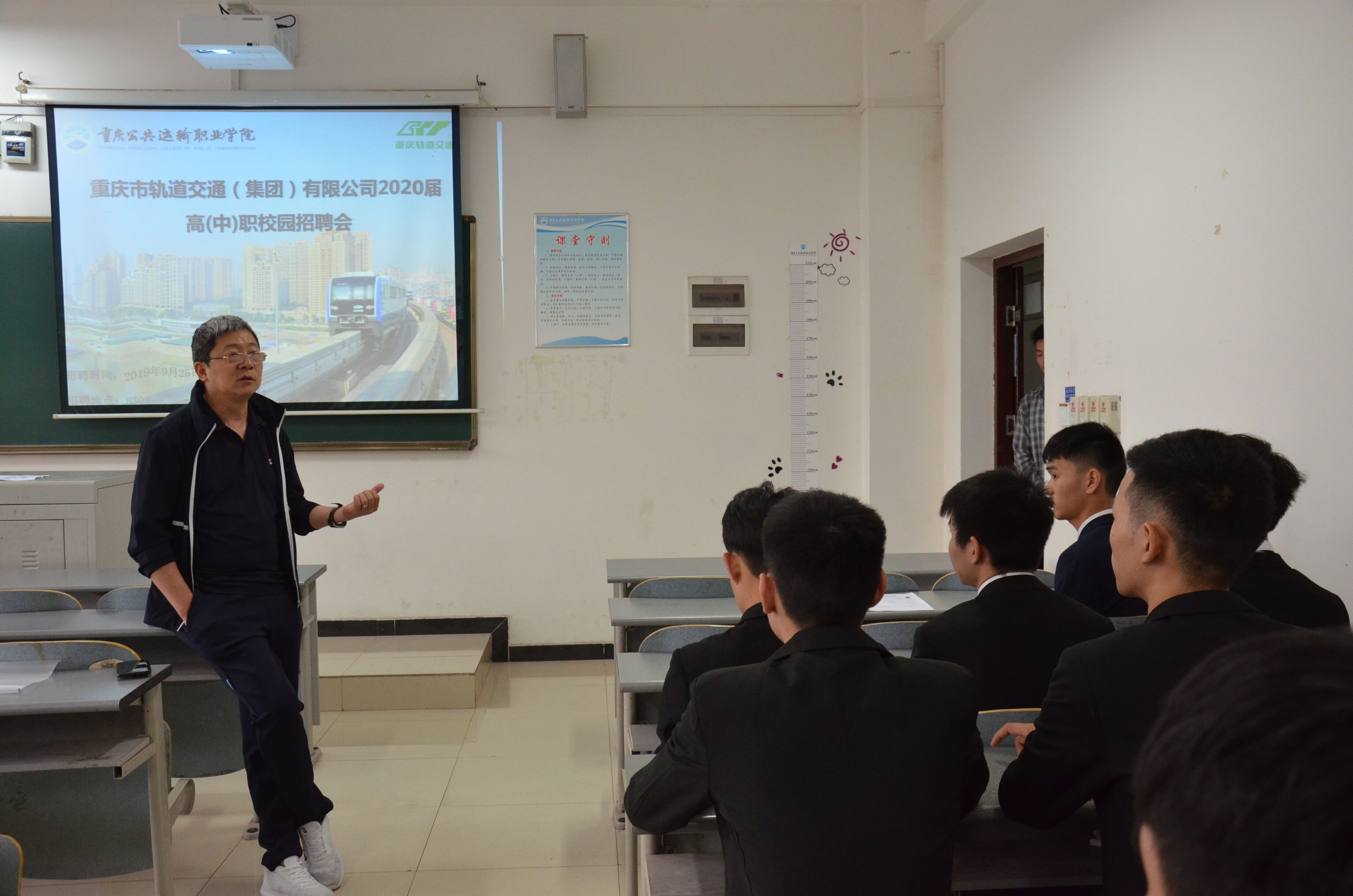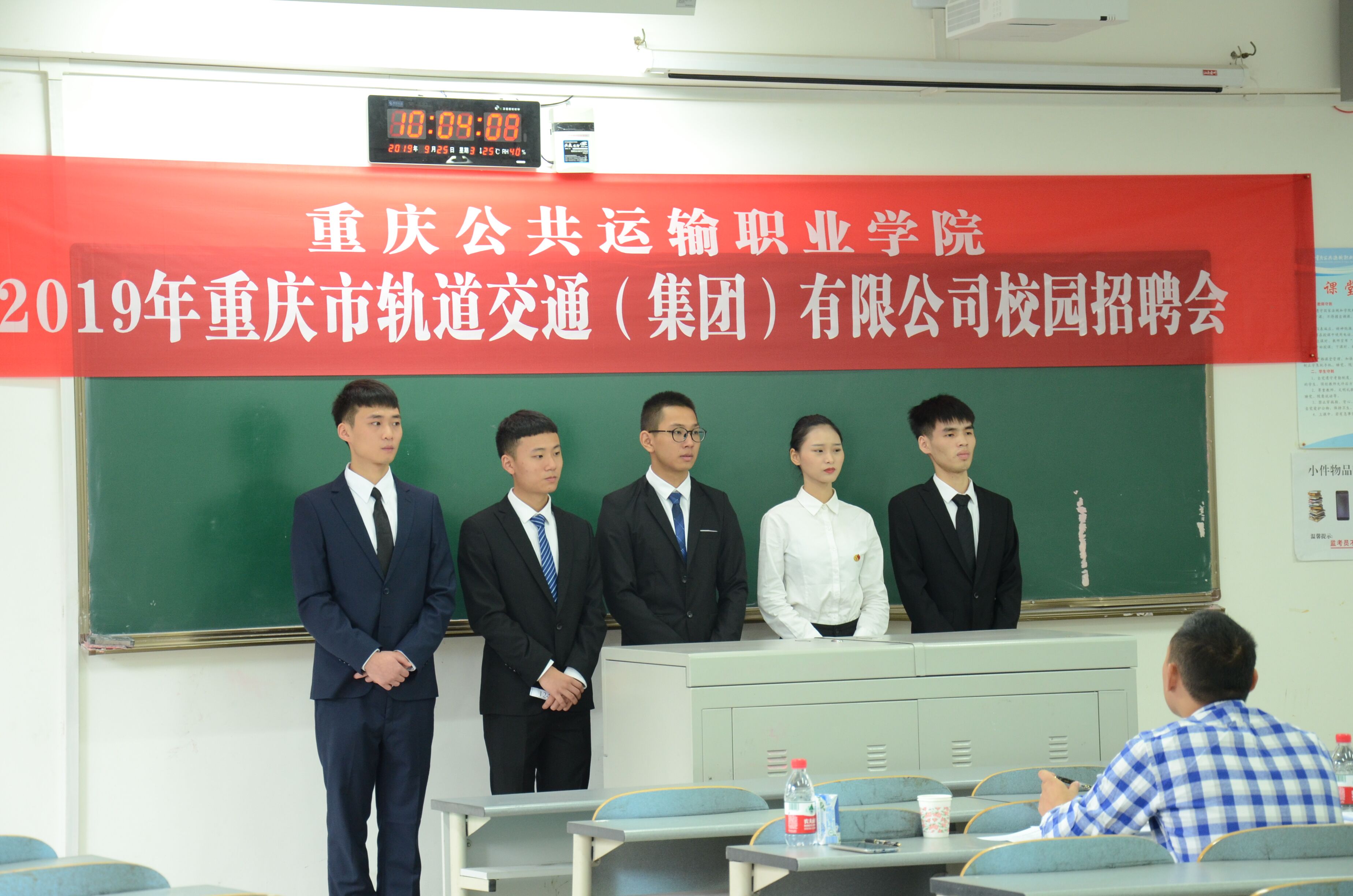 “为了山城有坦途,争做轨道螺丝钉”。9月24日上午,2019年重庆市轨道交通(集团)有限公司(以下简称轨道集团)专场校园招聘会在我院B栋教学楼举行。轨道集团提供站务安全员、电动列车司机、电动列车检修、信号维修、通信维修、变电检修、接触网维修7个招聘岗位,吸引了学院1500余名大三学生现场求职。