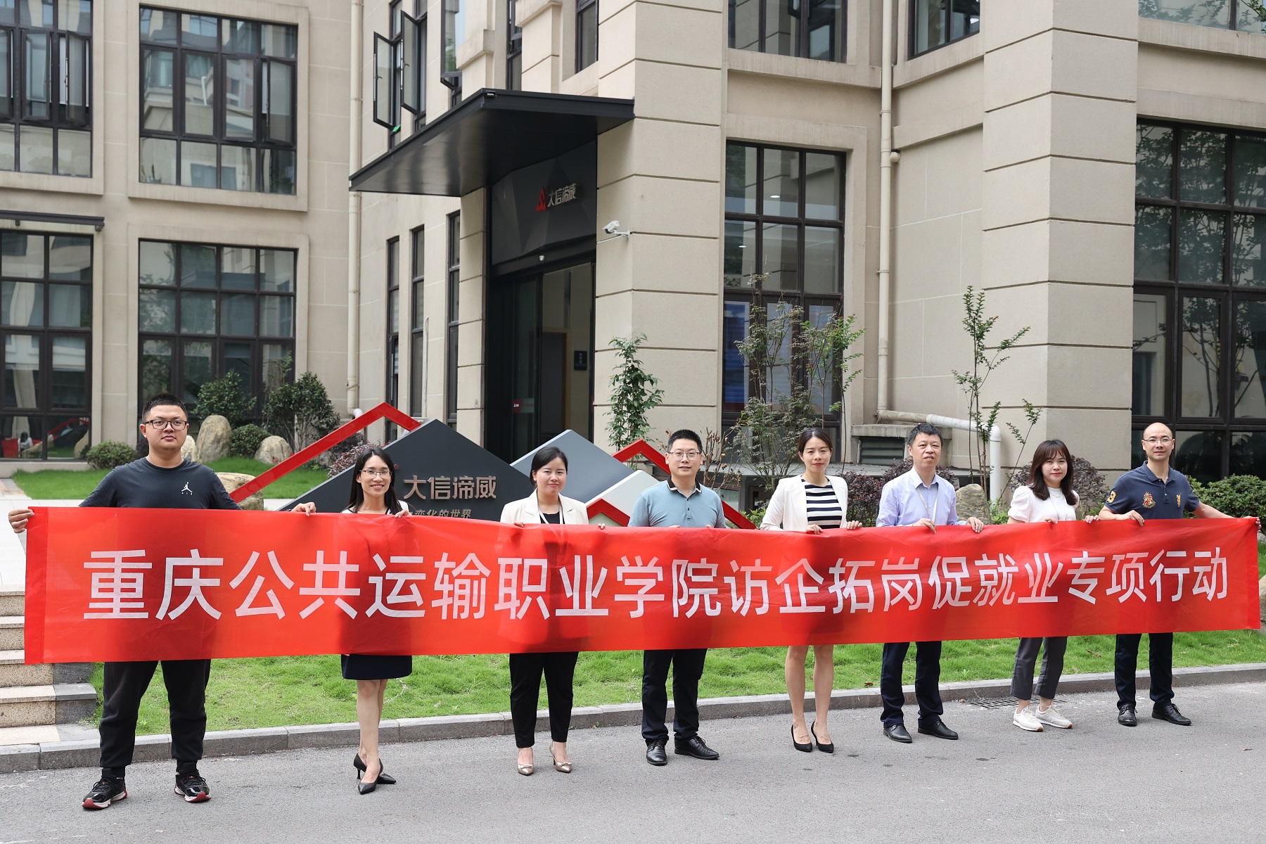 大信谛威集团人力资源部部门经理兼重庆谛威人力资源有限公司总经理佘斯娟、大信谛威集团信息部部门经理周杨、大信谛威集团综合部部门副经理周凤、大信谛威集团人力资源部培训经理张琴、学校党委书记彭超,运输贸易学院院长赵柱文,运输贸易学院党总支书记曾庆东,团总支书记库国静、参加了本次访企拓岗工作。