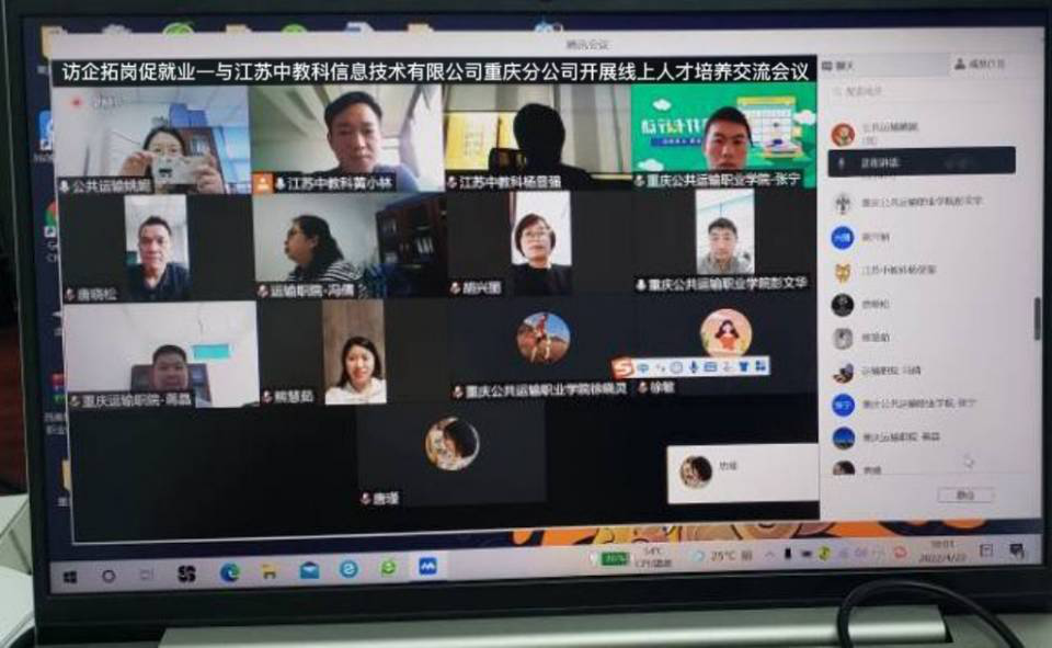 为深入贯彻落实党中央、国务院关于“稳就业”“促就业”决策部署,根据教育部和重庆市教委有关通知精神和要求,学校近期开展访企拓岗促就业专项行动。4月22日上午,校党委书记彭超组织开展了与江苏中教科信息技术有限公司重庆分公司开展线上人才培养交流会议。双方就深化校企合作、拓宽就业渠道、拓展就业岗位、开展实习实训、加强就业指导等方面进行了深入交流。智慧交通学院、轨道交通学院、运输贸易学院、公共管理学院、铁道与建筑学院、智能装备学院等单位有关负责同志参加。