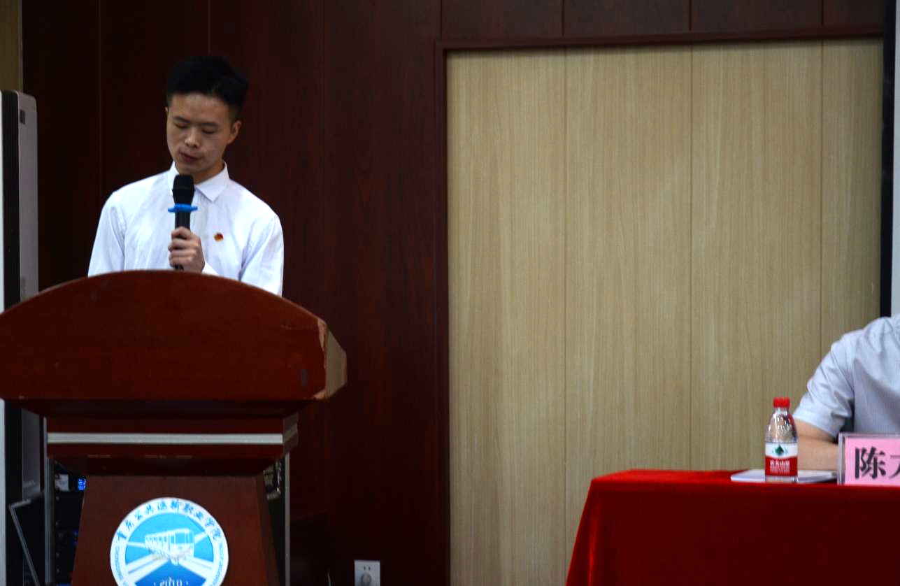 学校运输贸易学院学生冉伟代表全体参培学员发言,感谢党和国家的关怀帮助,以及学校提供的培训机会,他将努力把个人职业目标融入国家发展战略,不懈成长,报效祖国。他代表全体培训学员保证,遵规守矩,服从管理,做到学有所思、学有所得、学有所获。
