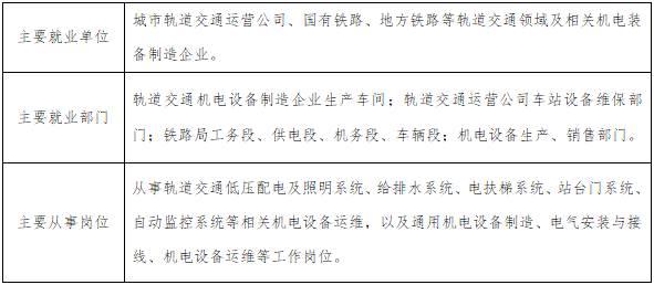 专业面向国家战略性新兴产业中高端装备制造领域的轨道交通装备产业,重点瞄准“轨道装备制造、轨道装备智能运维、机电系统装调”等关键岗位,面向轨道交通行业相关的车站机电设备系统检修、自动化监控系统维护的岗位(群),培养能够从事城市轨道交通车站综合机电设备检修、电梯检修、自动售检票系统检修、给排水系统检修、综合监控系统维护工作的高技能人才。