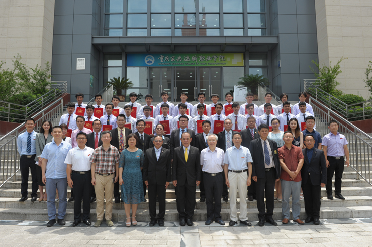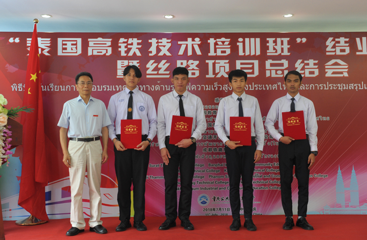 7月11日上午,“泰国高铁技术培训班”结业典礼暨 丝路项目总结会在学院举行。泰国职业教育委员会教育顾问沙隆·功卷迪奥(Sarojn Kojuantiaw),泰国职业教育委员会秘书提底蓬·翁哈(Thitipon Oonhaad),重庆市教委原巡视员、重庆教育国际交流协会会长胡斌,重庆教育国际交流协会秘书长乐勇,重庆教育国际交流协会服务中心主任谢世波等中泰嘉宾与学院领导班子参加了典礼和总结会。本次典礼和总结会由学院常务副院长李海峰主持。结业典礼上,学院院长赵月望为28名“泰国高铁技术培训班”留学生颁发了结业证书,并为优秀毕业生颁发了奖状。