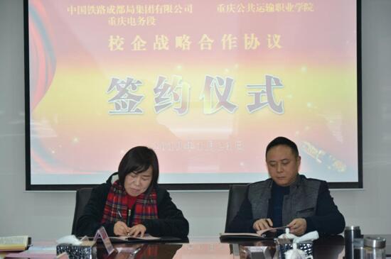 仪式上,组织观看了学院形象宣传片,学院党委书记彭超、中国铁路成都局集团有限公司重庆电务段段长余涛代表校企双方,在《校企战略合作协议书》上签字,宾主双方围绕建立长期、稳定、健康、互利共赢的长远合作关系进行座谈交流。