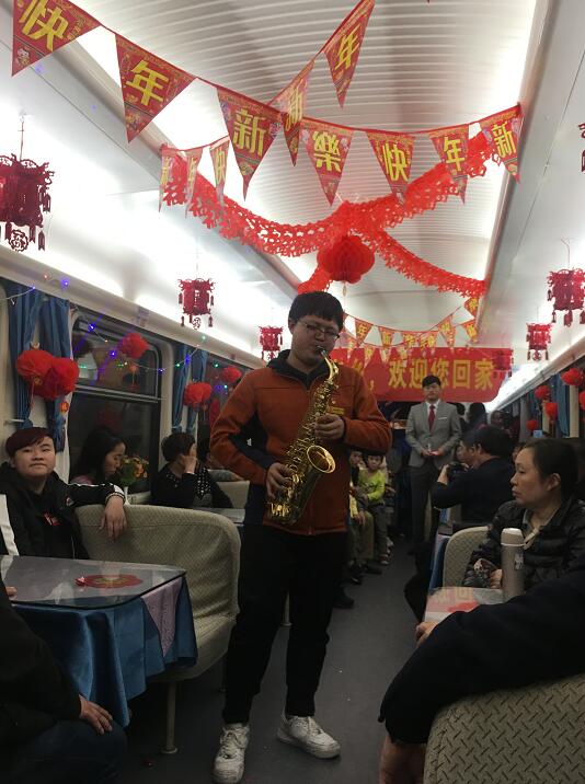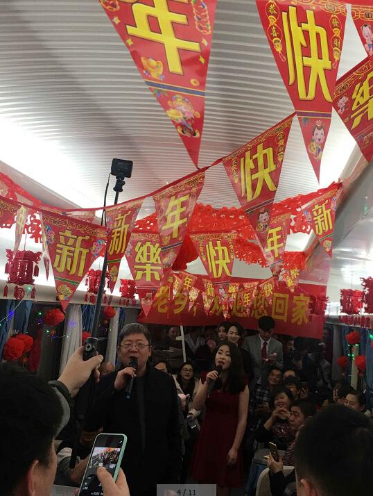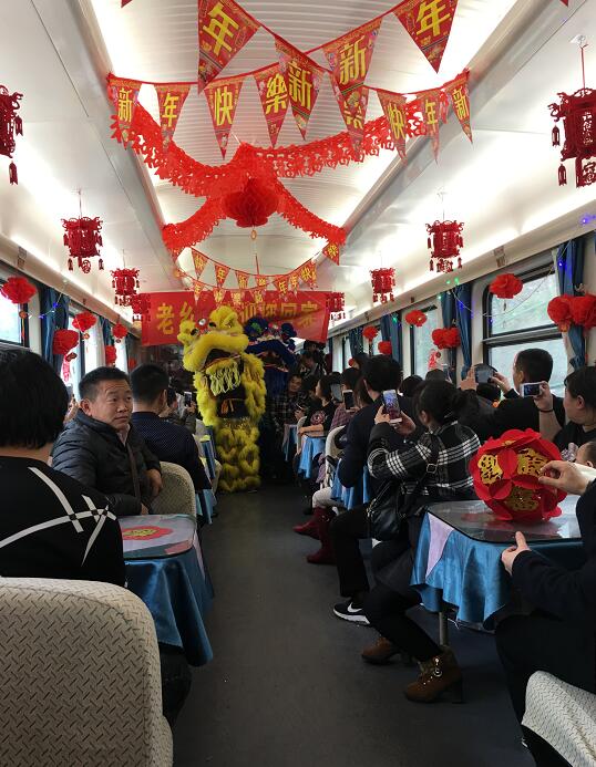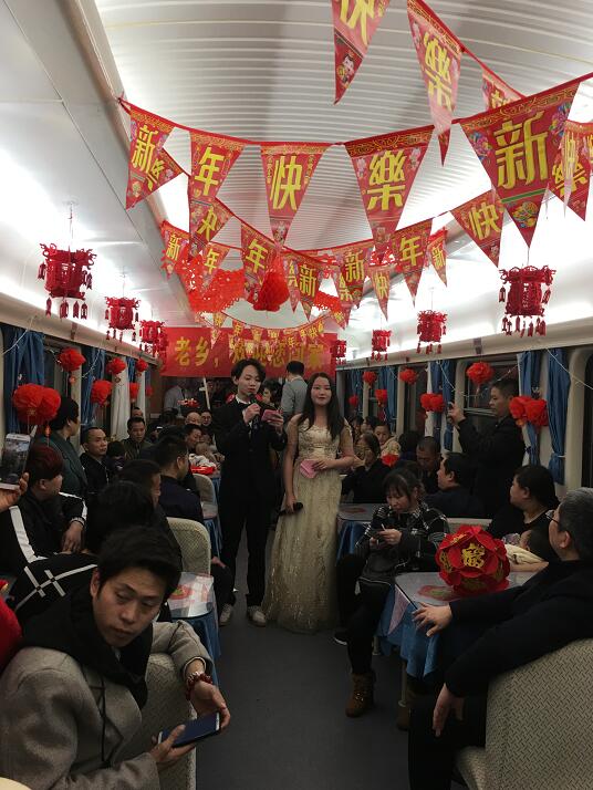 表演持续1个小时左右时间结束。列车向终点重庆隆隆进发。车上空间有限,车外寒风凛冽,车内却春意融融,到处是欢歌笑语、掌声不断。